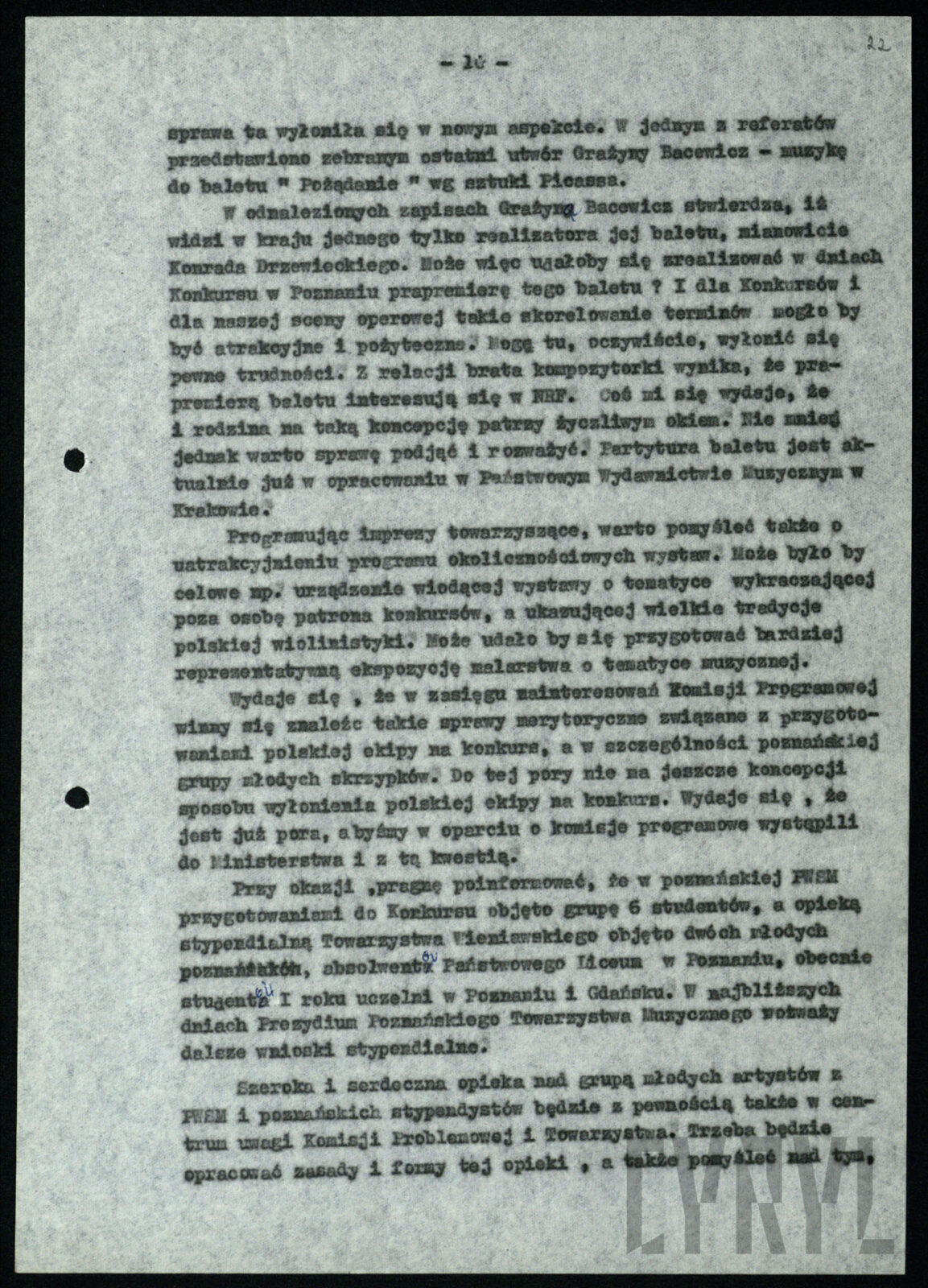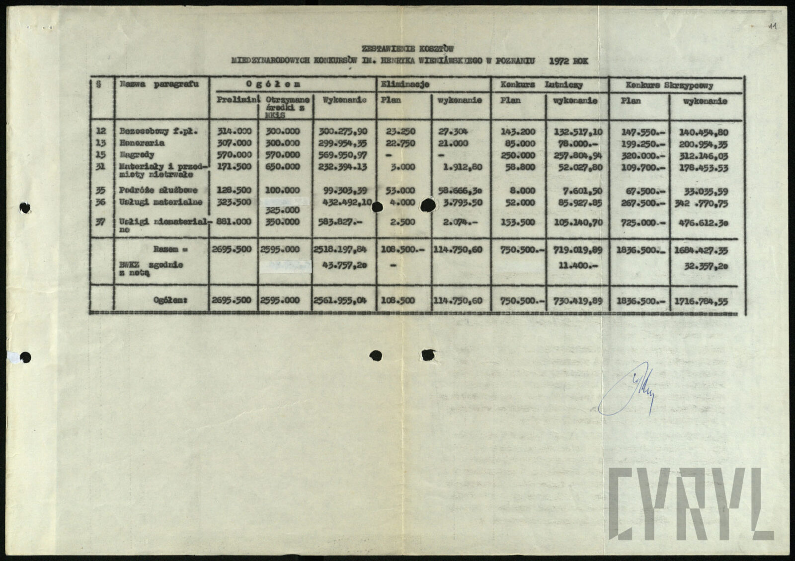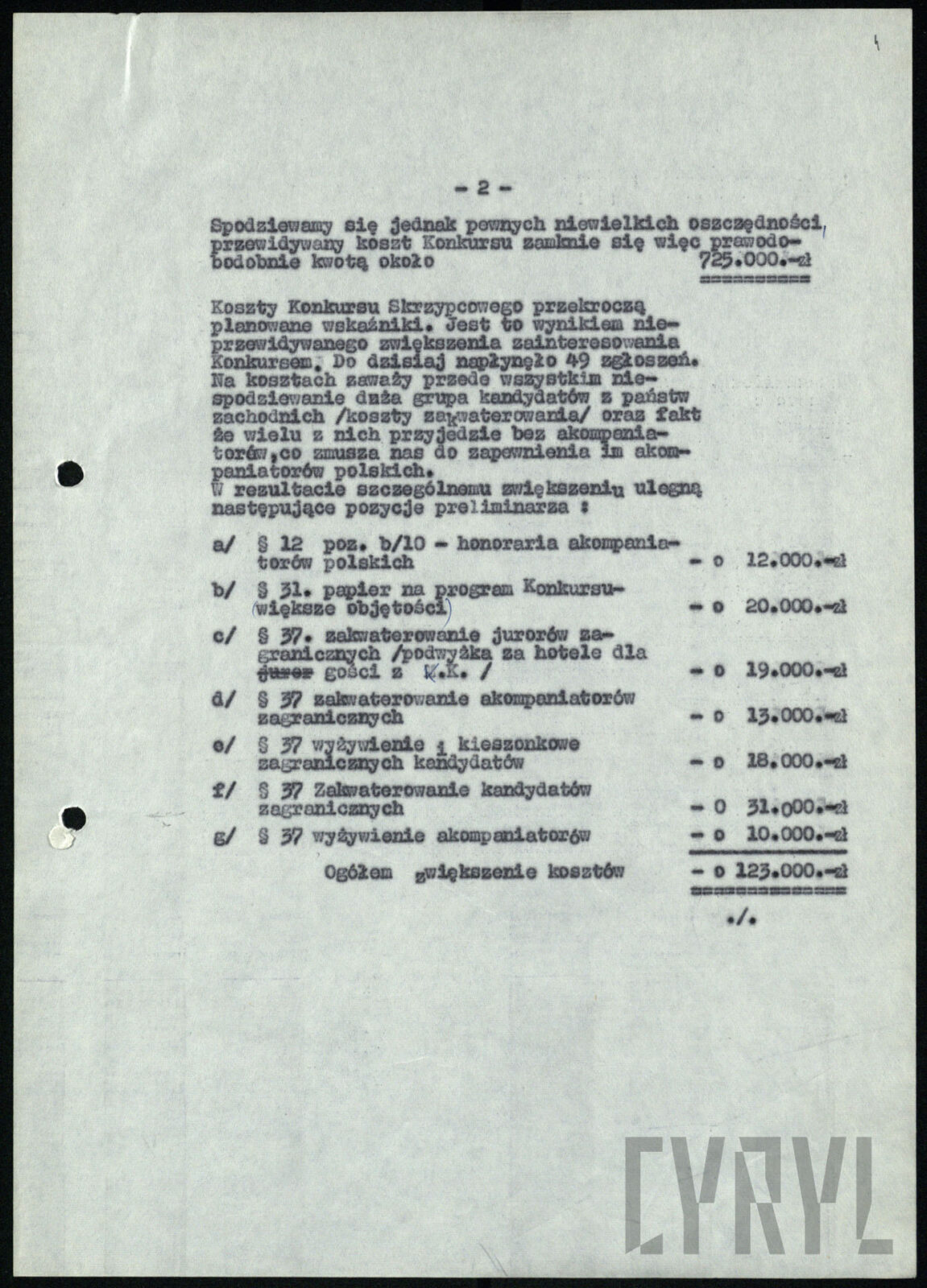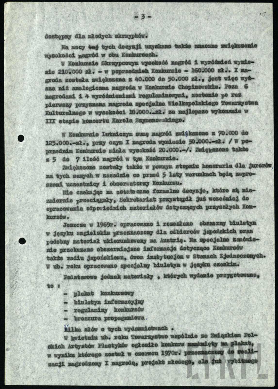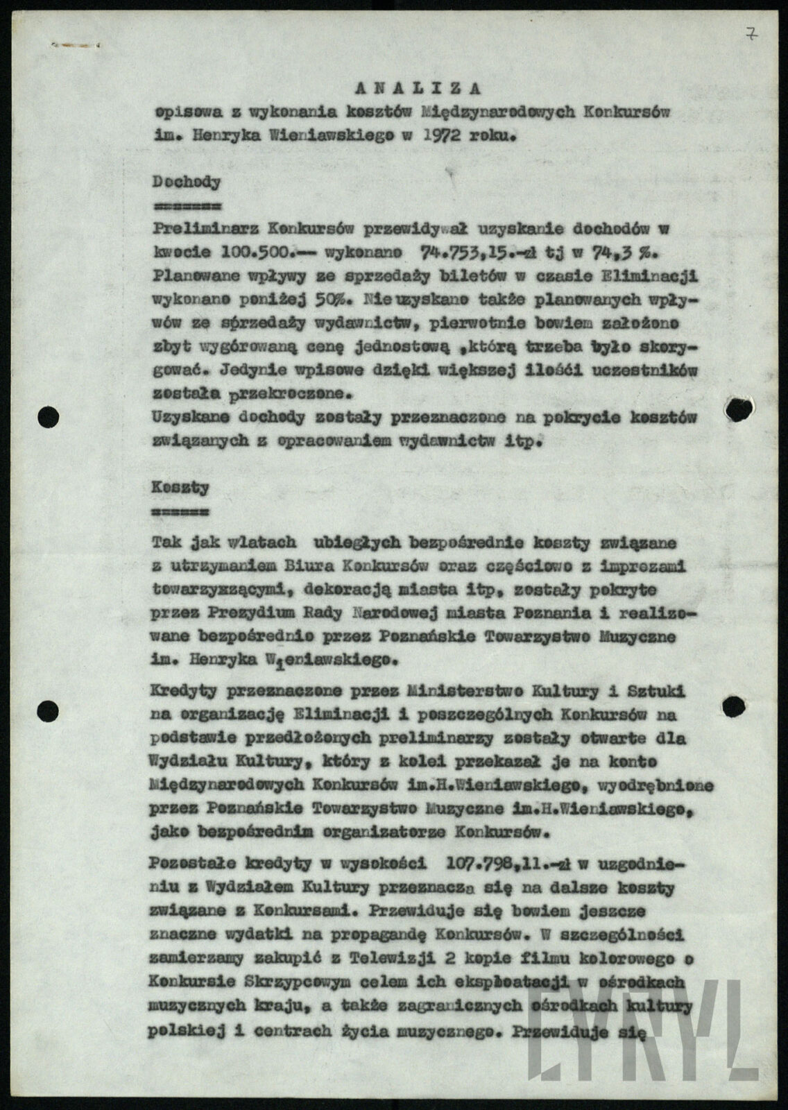 Korespondencja związana z kosztami przeznaczonymi na organizację Międzynarodowych Konkursów im. Henryka Wieniawskiego (lutniczego i skrzypcowego)22.03.1972