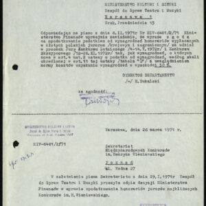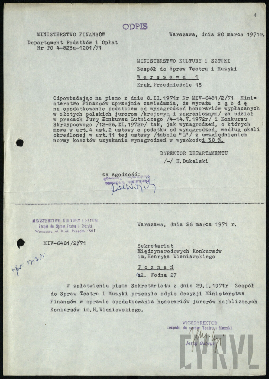 Korespondencja w sprawie opodatkowania honorariów jurorów Międzynarodowych Konkursów im. Henryka Wieniawskiego (lutniczego i skrzypcowego)20.03.1971–26.03.1971