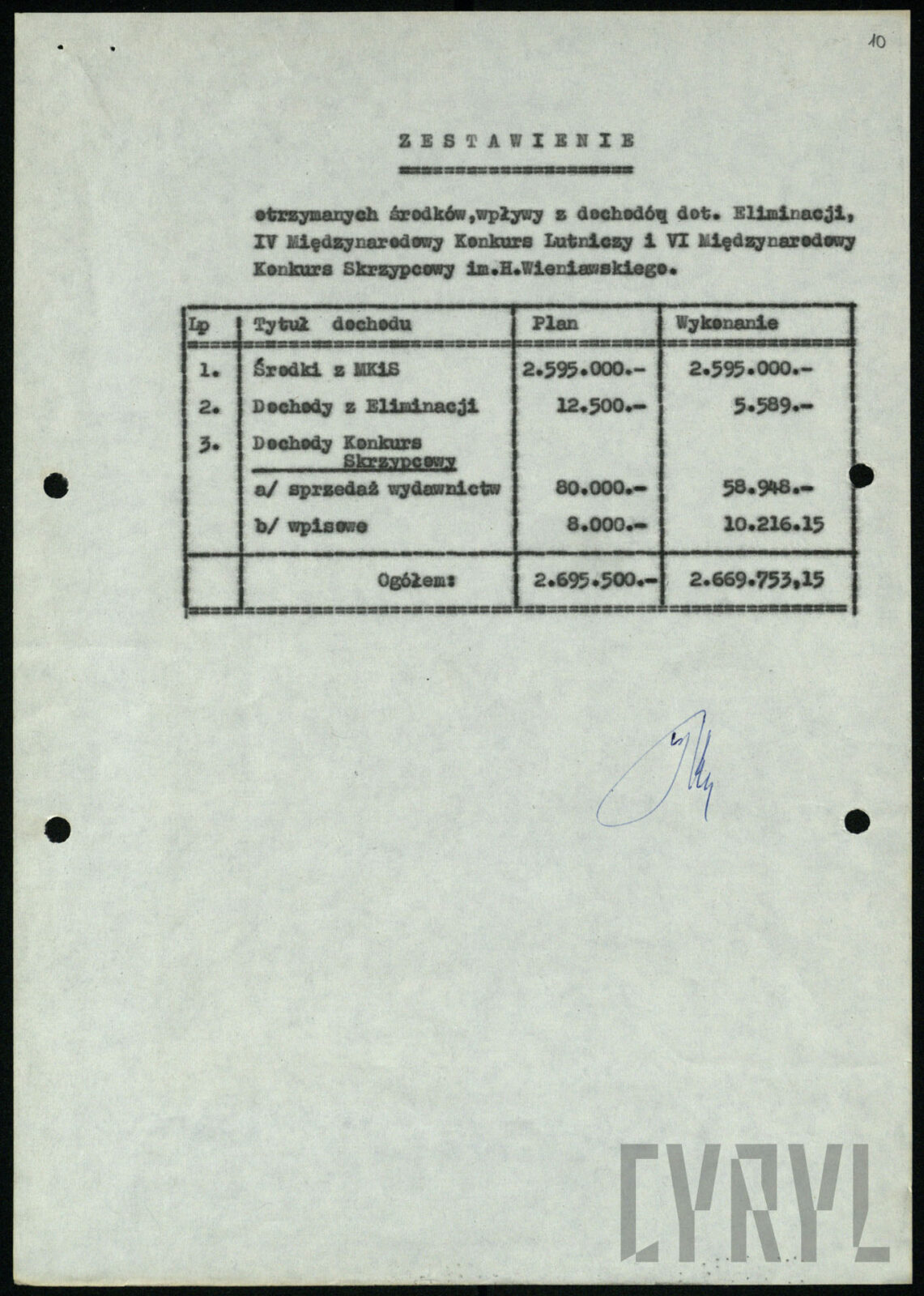 Zestawienie otrzymanych środków, wpływy z dochodów z eliminacji do VI Międzynarodowego Konkursu Skrzypcowego im. Henryka Wieniawskiego i IV Międzynarodowego Konkursu Lutniczego01.01.1972