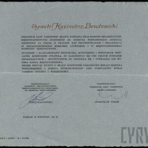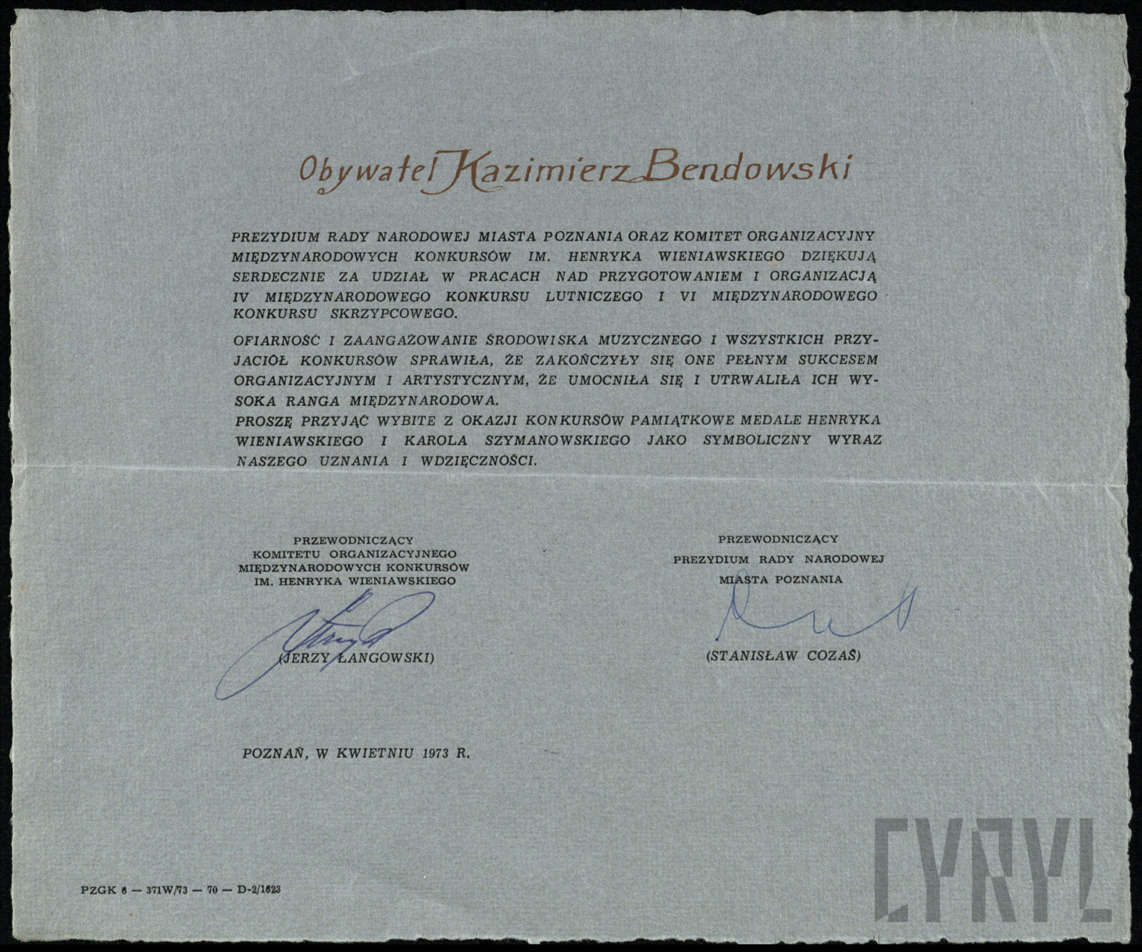 Podziękowania dla Kazimierza Bendowskiego za udział w pracach nad przygotowaniem i organizacją IV Międzynarodowego Konkursu Lutniczego i VI Międzynarodowego Konkursu Skrzypcowego im. Henryka Wieniawskiego04.1973