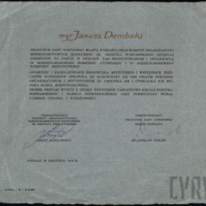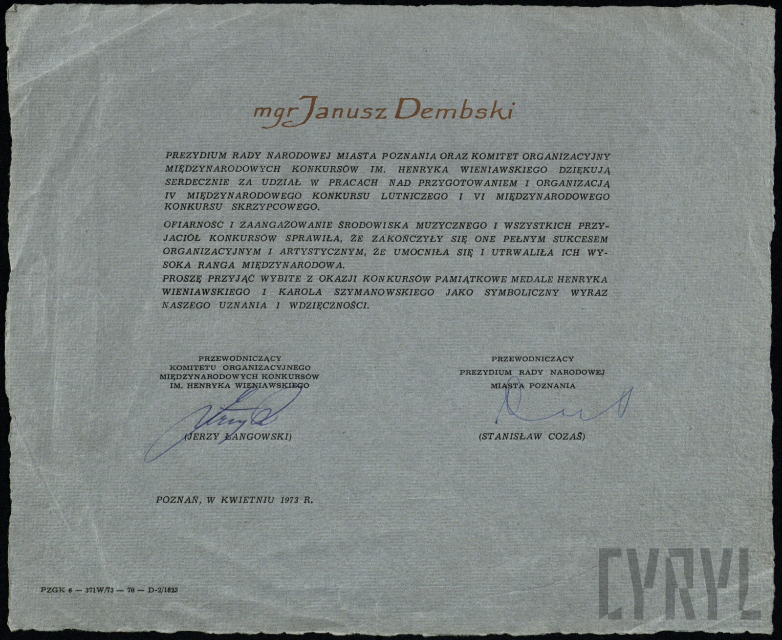 Podziękowania dla Janusza Dembskiego za udział w pracach nad przygotowaniem i organizacją IV Międzynarodowego Konkursu Lutniczego i VI Międzynarodowego Konkursu Skrzypcowego im. Henryka Wieniawskiego04.1973