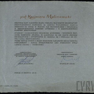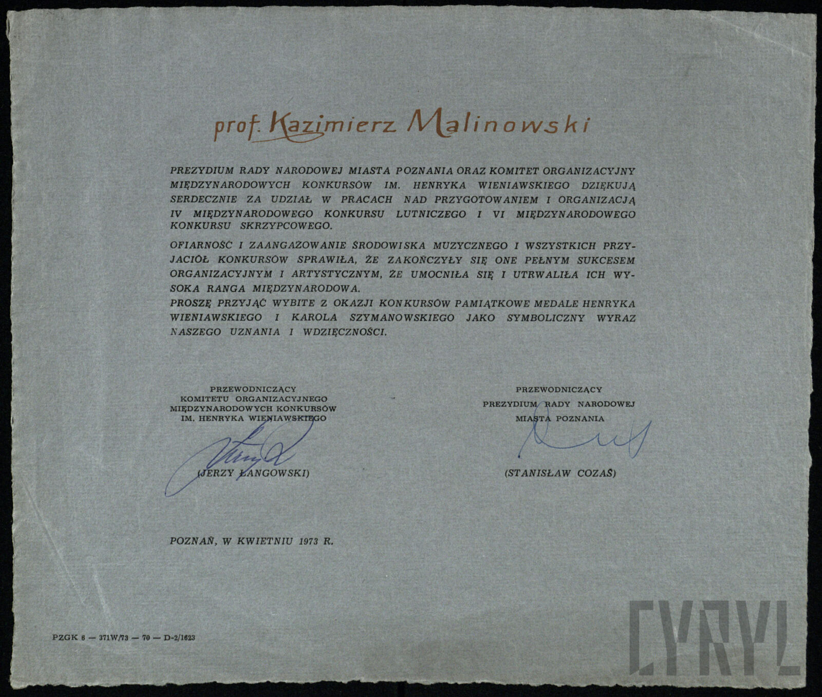 Podziękowania dla Kazimierza Malinowskiego za udział w pracach nad przygotowaniem i organizacją IV Międzynarodowego Konkursu Lutniczego i VI Międzynarodowego Konkursu Skrzypcowego im. Henryka Wieniawskiego04.1973