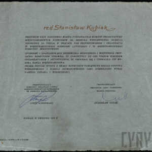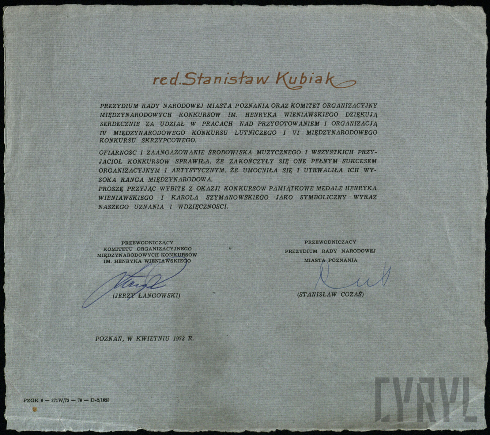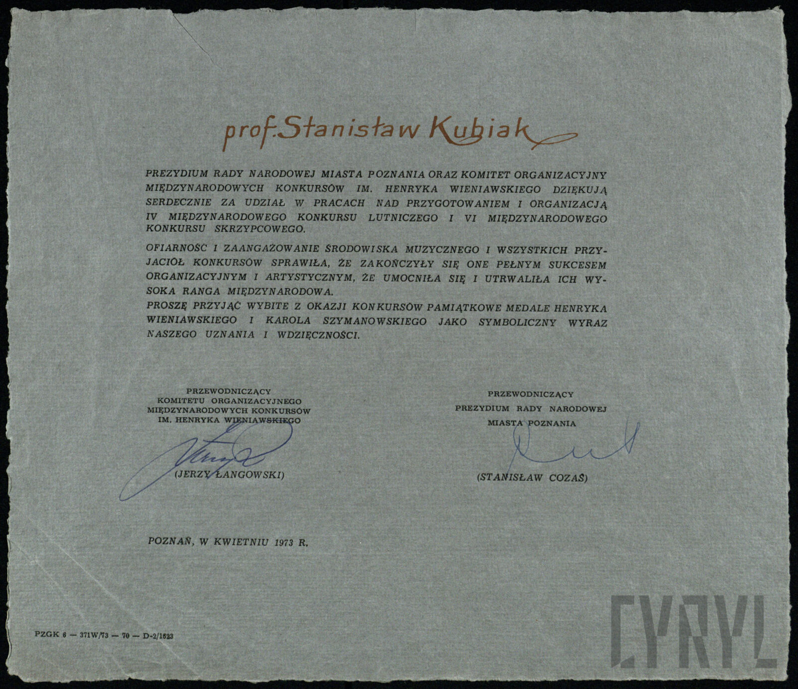Podziękowania dla redaktora Stanisława Kubiaka za udział w pracach nad przygotowaniem i organizacją IV Międzynarodowego Konkursu Lutniczego i VI Międzynarodowego Konkursu Skrzypcowego im. Henryka Wieniawskiego04.1973