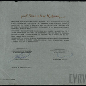 Podziękowania dla prof. Stanisława Kubiaka za udział w pracach nad przygotowaniem i organizacją IV Międzynarodowego Konkursu Lutniczego i VI Międzynarodowego Konkursu Skrzypcowego im. Henryka Wieniawskiego04.1973