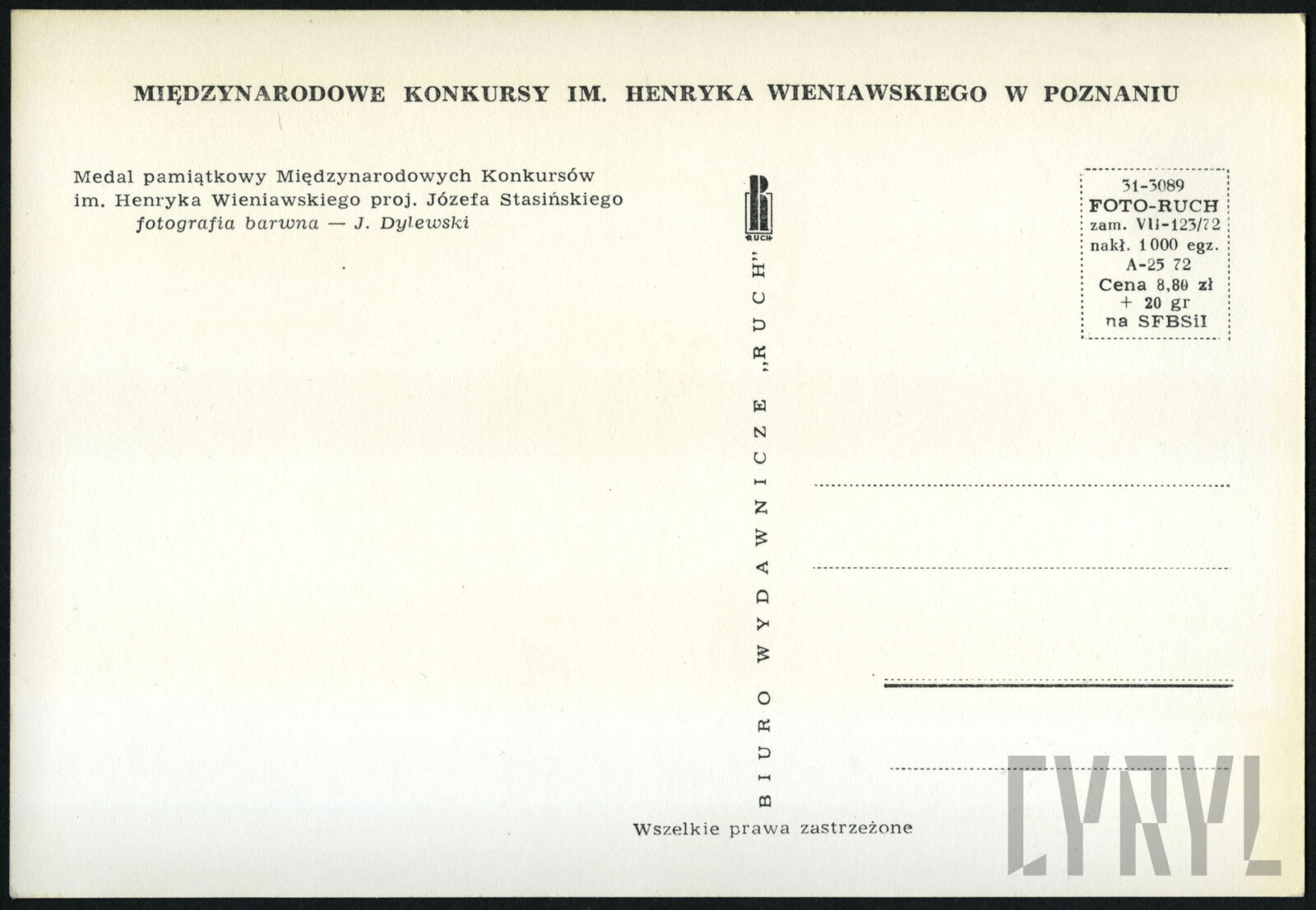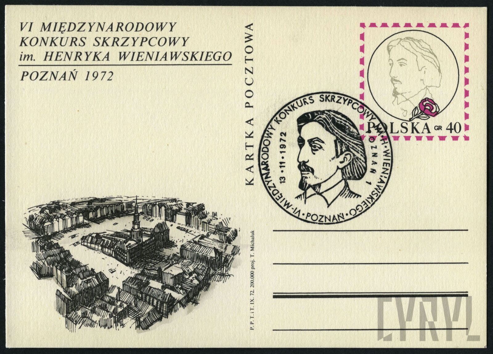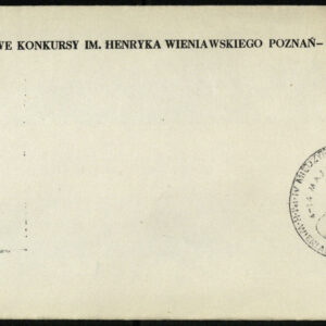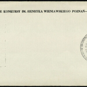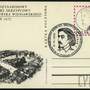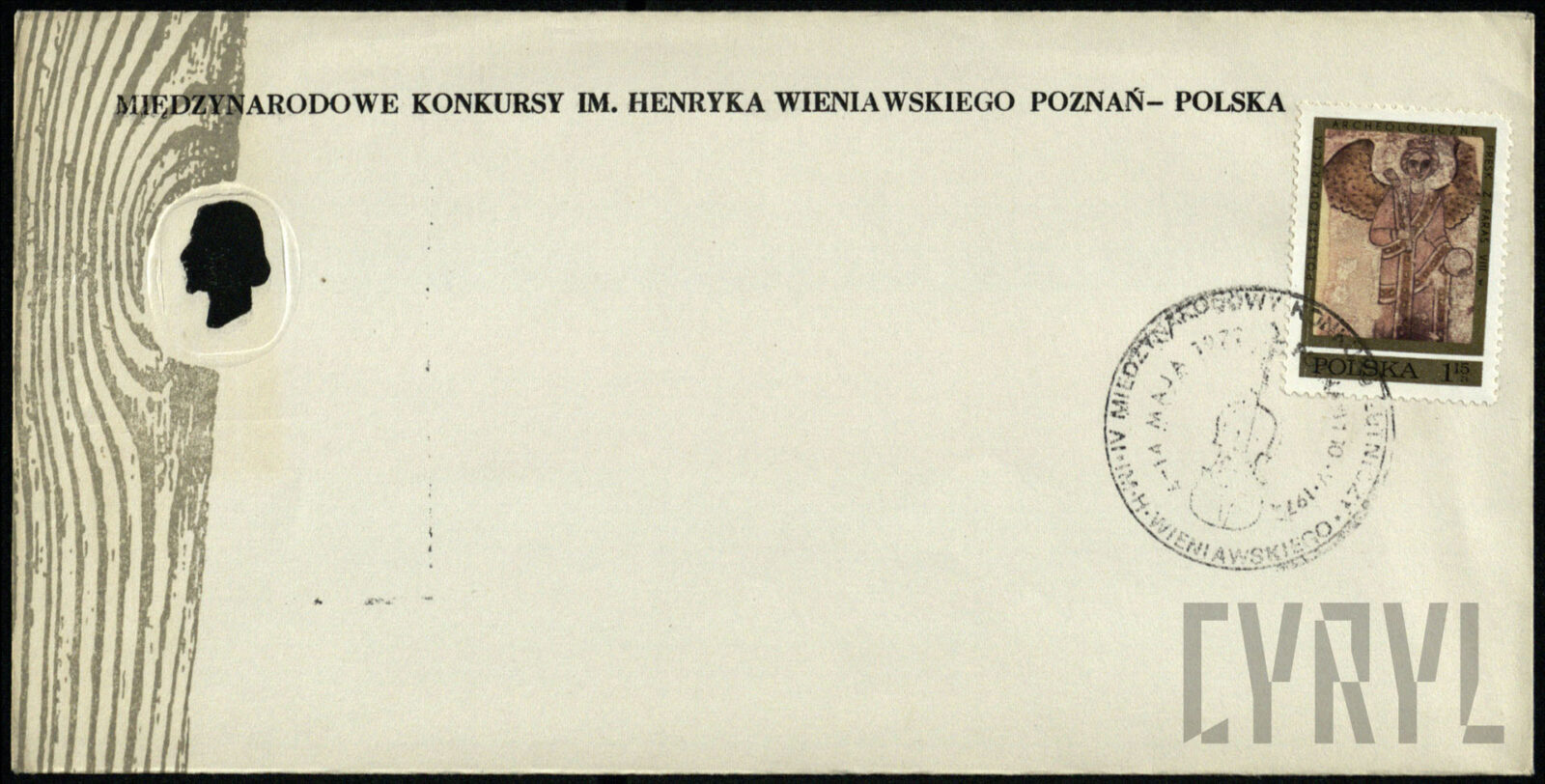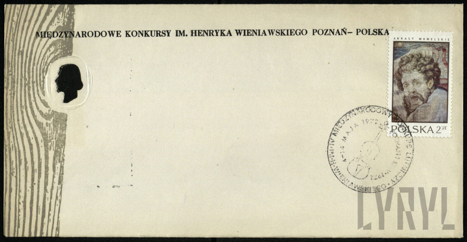 Koperta wydana z okazji Międzynarodowych Konkursów im. Henryka Wieniawskiego z okolicznościowym stemplem IV Międzynarodowego Konkursu Lutniczego04.05.1972–14.05.1972