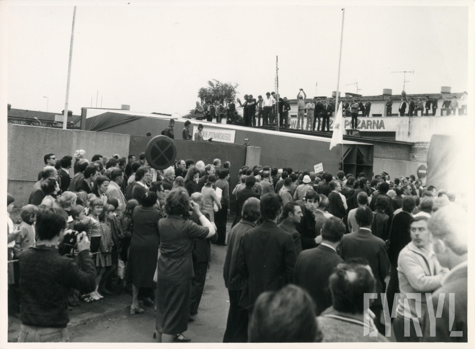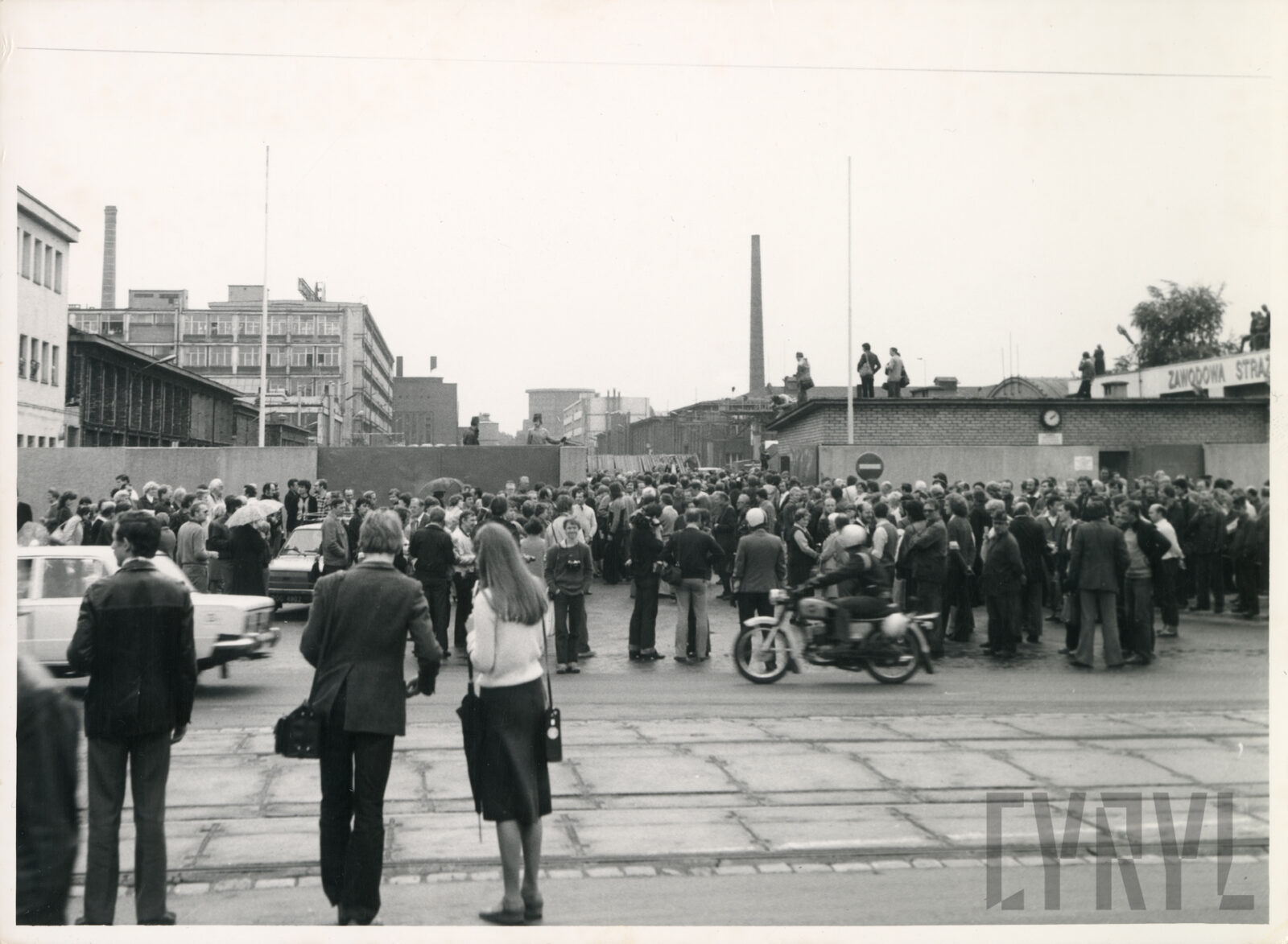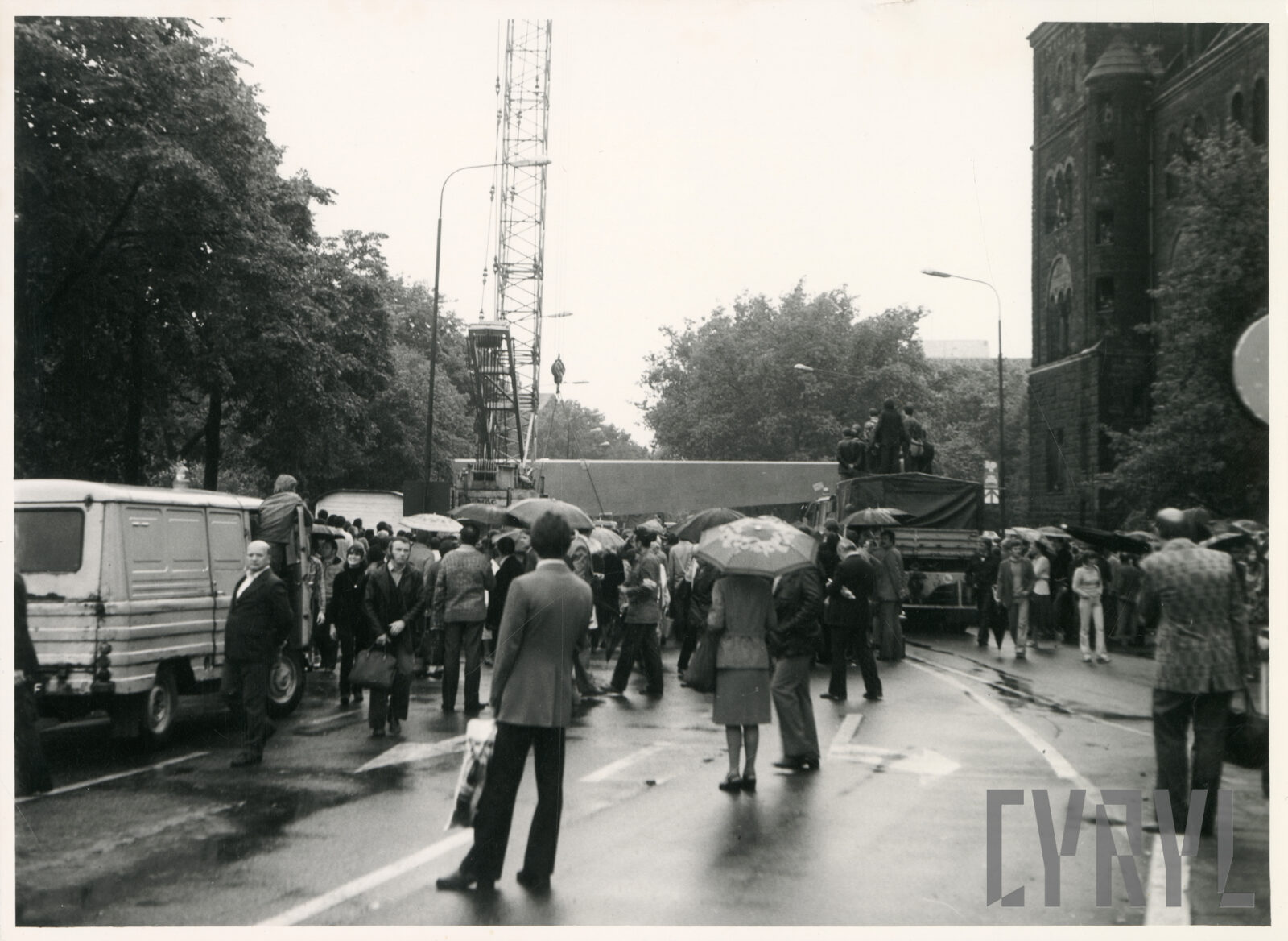 Poznaniacy oczkujący na wyjazd elementów pomnika Poznańskiego Czerwca 1956 z terenu Zakładów Metalowych H. Cegielski na pl. Mickiewicza