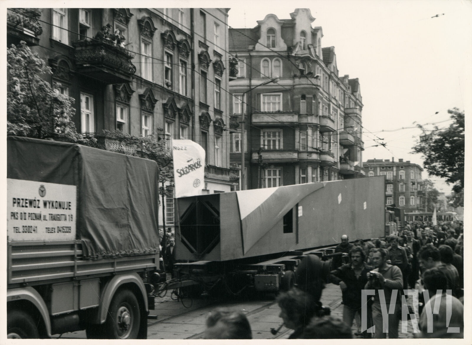 Transport elementów pomnika Poznańskiego Czerwca 1956 z terenu Zakładów Metalowych H. Cegielskiego na pl. Mickiewicza