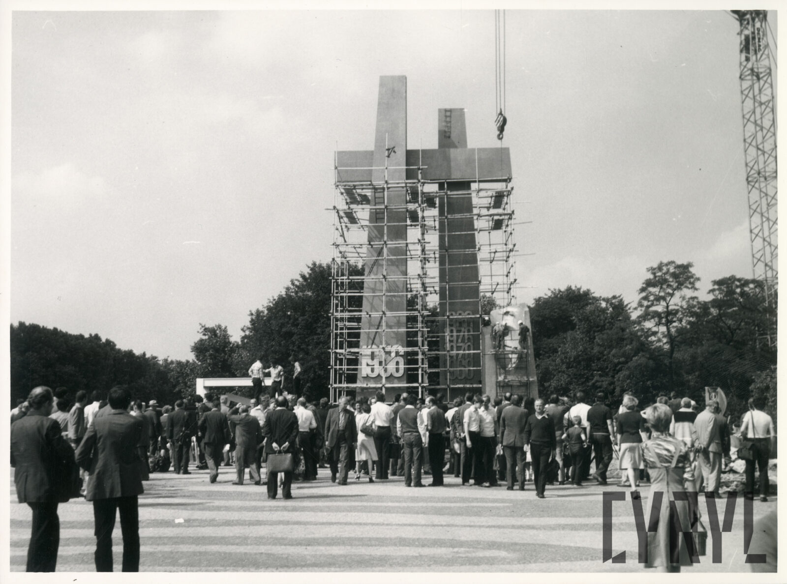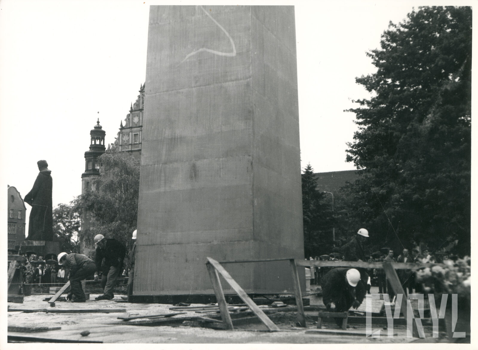 Robotnicy pracujący przy montażu pomnika Poznańskiego Czerwca 1956 na pl. Mickiewicza , w głębi fragment Pałacu Kultury (dzisiaj CK Zamek)
