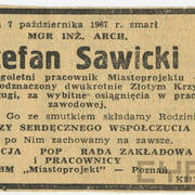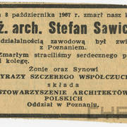 W XX wieku Poznań miał wyjątkowe szczęście do architektów. Mieszkali i pracowali tutaj twórcy tej klasy, co Adam Ballenstedt, Stefan Cybichowski, Władysław Czarnecki, Marian Andrzejewski, czy budowniczy Pewuki Roger Sławski. Wśród tej plejady znakomitości umykają zazwyczaj nazwiska architektów, którzy, współpracując lub rywalizując z tymi największymi, pozostawili po sobie trwały ślad w poznańskiej przestrzeni miejskiej. Do grona owych nieco zapomnianych, acz wielce dla Poznania zasłużonych architektów należy z całą pewnością Stefan Sawicki. Przyszedł na świat w Dreźnie jako syn mistrza krawieckiego Ludwika, który zaledwie rok wcześniej wyemigrował do Saksonii z Poznańskiego. W 1913 roku w Dreźnie ukończył z wyróżnieniem Saską Królewską Szkołę Budowlaną, praktykując w tym czasie u kilku znanych saskich architektów. Miał 23 lata, kiedy rozpoczął pracę w Wydziale Budowlanym drezdeńskiego magistratu, gdzie trafił pod skrzydła samego Hansa Poelziga (w Poznaniu zbudował słynną Wieżę Górnośląską i Fabrykę Moritza Milcha, obecnie Zakłady Chemiczne w Luboniu). Błyskawicznej kariery Sawickiego nie przerwało nawet powołanie do wojska w 1917 roku, gdyż funkcję rzeczoznawcy budowlanego w Saskim Ministerstwie Wojny pozwolono mu łączyć ze studiami na miejscowej politechnice. W 1919 roku zrezygnował z dotychczasowej pozycji szanowanego saskiego obywatela i postanowił wrócić do odradzającej się Ojczyzny. Zamieszkał w Poznaniu, gdzie początkowo terminował u Ballenstedta, przez kilka następnych lat pracował w Urzędzie Wojewódzkim Poznańskim, potem razem z Rogerem Sławskim budował Pewukę, by wreszcie w połowie lat 30. założyć własną, cenioną pracownię. Według jego projektów powstało wówczas w Poznaniu kilka okazałych domów i willi miejskich oraz gmach dawnego Zakładu Fundacji Kościelnej im. Bolesława i Anieli Twardowskich (obecnie Komenda Wojewódzka Policji przy ul. Kochanowskiego). Po ciemnych latach II wojny światowej, którą szczęśliwie przetrwał w Poznaniu, ponownie rzucił się w wir pracy, najpierw w poznańskim zarządzie miejskim, później zaś w „Miastoprojekcie”, biorąc m.in. udział w odbudowie ze zniszczeń wojennych poznańskiego ratusza, Starego Rynku, fary, kościołów św. Marcina i św. Anny.