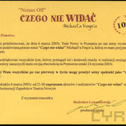 List okolicznościowy Radosława Lewandowskiego, producenta spektaklu "Czego nie widać" Michaela Frayna w reżyserii Eugeniusza Korina, z okazji setnego wystawienia sztuki2005