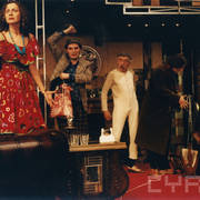 Grażyna Korin (Dotty Otley), Mirosław Kropielnicki (Lloyds Dallas) i Mariusz Sabiniewicz (Frederick Fellowes) w spektaklu "Czego nie widać" Michaela Frayna w reżyserii Eugeniusza Korina24.01.2003