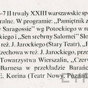 Notatka prasowa dotycząca rozpoczęcia festiwalu "Warszawskie Spotkania Teatralne", w ramach którego wystawiono m.in. spektakl "Czerwone nosy" Petera Barnesa w reżyserii Eugeniusza Korina27.01.1994