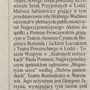 Relacja z benefisu z okazji 10-lecia firmy Tadmar, której założycielem był m.in. Marek Bykowski, miłośnik teatru i producent spektaklu "Fredro dla dorosłych" wystawionego na deskach Teatru Nowego14.04.2000