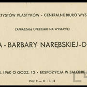 Na zorganizowanej przez Związek Polskich Artystów Plastyków i Centralne Biuro Wystaw Artystycznych w salonie ZPAP przy pl. Wolności wystawie zaprezentowano najnowsze prace toruńskiej artystki Barbary Narębskiej-Dębskiej z lat 1958-59. Wśród nich przeważały kolorowe akwatinty z pejzażami paryskimi i widokami Torunia.