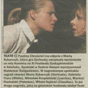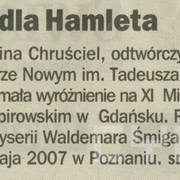 Informacja o przyznaniu wyróżnienia dla Pauliny Chruściel za rolę Hamleta w spektaklu w reżyserii Waldemara Śmigasiewicza wystawionym w ramach XI Międzynarodowego Festiwalu Szekspirowskiego w Gdańsku01.06.2007