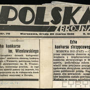 Pierwszy konkurs skrzypcowy odbył się w 1935 roku w Warszawie w setną rocznicę urodzin patrona, wybitnego polskiego wirtuoza skrzypiec i kompozytora. Inicjatorem tego wydarzenia i przewodniczącym jury był bratanek Henryka Wieniawskiego Adam, także kompozytor, ale także pedagog, w latach 1932 i 1937 przewodniczący jury Międzynarodowego Konkursu Pianistycznego im. Fryderyka Chopina. Protektorem konkursu został prezydent RP Ignacy Mościcki, a organizatorem Wyższa Szkoła Muzyczna im. Fryderyka Chopina. W komitecie honorowym zasiadły wybitne osobistości, m.in. premier Leon Kozłowski, minister spraw zagranicznych Józef Beck i prezydent Warszawy Stefan Starzyński. Laureatką I nagrody została młodziutka Ginette Neveu z Francji, której wspaniałą karierę przerwała śmierć w katastrofie lotniczej w 1949 roku. Laureatem II nagrody został Dawid Ojstrach, dzisiaj uważany za jednego z najznakomitszych wirtuozów skrzypiec XX wieku. To był pierwszy i ostatni Konkurs Skrzypcowy im. H. Wieniawskiego, który odbył się w Warszawie. Wszystkie kolejne zorganizowano już w Poznaniu.