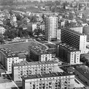 Modernistyczny wieżowiec na pl. Waryńskiego z lotu ptaka