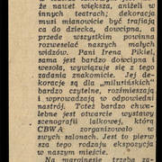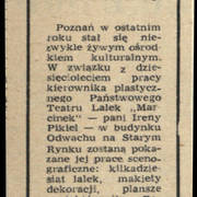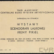 Irena Pikiel urodziła się w 1900 roku w Petersburgu. Przez całe życie związana była z teatrami lakowymi. Była dyrektorem teatru Baj Pomorski w Toruniu, od 1961 roku związana była z Teatrem Młodego Widza w Poznaniu. A w latach 1961-64 sprawowała funkcję dyrektora Teatru Lalek i Aktora Pleciuga w Szczecinie. Zmarła 15 marca 1991 roku. Wystawę jej prac scenograficznych zorganizowali wspólnie: „Marcinek” Państwowy Teatr Lalki i Aktora w Poznaniu, Związek Polskich Artystów Plastyków i Centralne Biuro Wystaw Artystycznych Poznań pod protektoratem wiceministra kultury i sztuki Edwarda Marca. Wśród zachowanej dokumentacji znalazły się: katalog, zaproszenie na wystawę, plakat i wycinki prasowe.