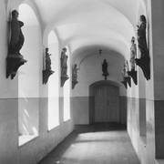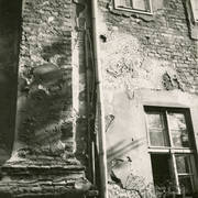 Fragment elewacji zachodniej dawnego klasztoru Reformatów w miejscu połączenia z kościołem św. Kazimierza (pod odpadającymi tynkami widoczne fragmenty dawnej polichromii)10.1957
