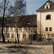 Wschodnia elewacja dawnego klasztoru Reformatów (obecnie Ośrodek Szkolno-Wychowawczy dla Dzieci Niesłyszących im. Józefa Sikorskiego), z prawej fragment prezbiterium kościoła św. Kazimierza (obecnie parafia polskokatolicka)04.1996