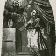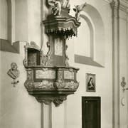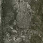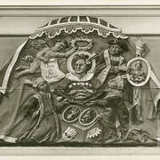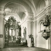 Antepedium (zakrycie, zasłona) ołtarza głównego z polichromowaną, płaskorzeźbioną apoteozą patrona świątyni w poreformackim kościele św. Kazimierza1942