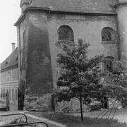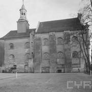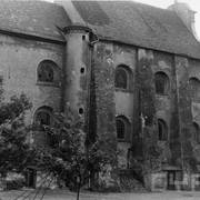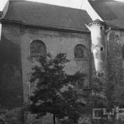 Północna elewacja części prezbiterialnej poreformackiego kościoła św. Kazimierza (obecnie parafia polskokatolicka), w tle zabudowania poklasztorne06.07.1956