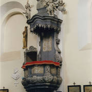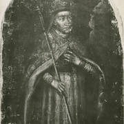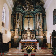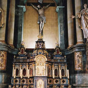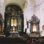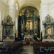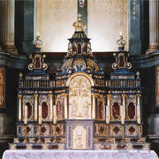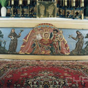 Antepedium (zakrycie, zasłona) ołtarza głównego z polichromowaną, płaskorzeźbioną apoteozą patrona świątyni w poreformackim kościele św. Kazimierza (obecnie parafia polskokatolicka)2000