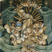 Zwieńczenie ołtarza głównego, wizerunek Boga Ojca na obłokach w otoczeniu główek anielskich w poreformackim kościele św. Kazimierza (obecnie parafia polskokatolicka)2000