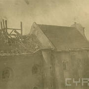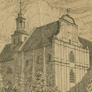 Północna elewacja poreformackiego kościoła św. Kazimierza ze skarpami wzmacniającymi budowlę i sygnaturką nad prezbiterium zniszczoną w 1945 roku, przed 1939 rokiem (obecnie parafia polskokatolicka)