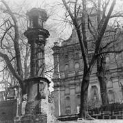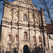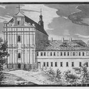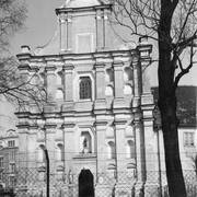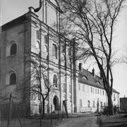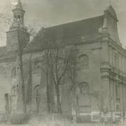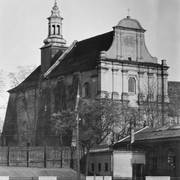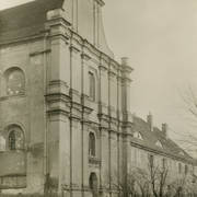 Poreformacki kościół św. Kazimierza od strony północno-zachodniej (obecnie parafia polskokatolicka), w głębi zabudowania poklasztorne mieszczące szkołę dla dzieci niesłyszących, przed 1939 rokiem