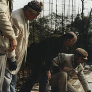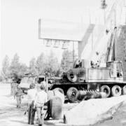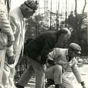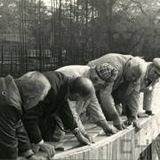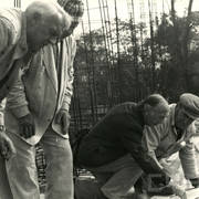 Profesor Włodzimierz Wojciechowski (drugi od prawej) na placu budowy kościoła Świętej Rodziny na os. Kopernika