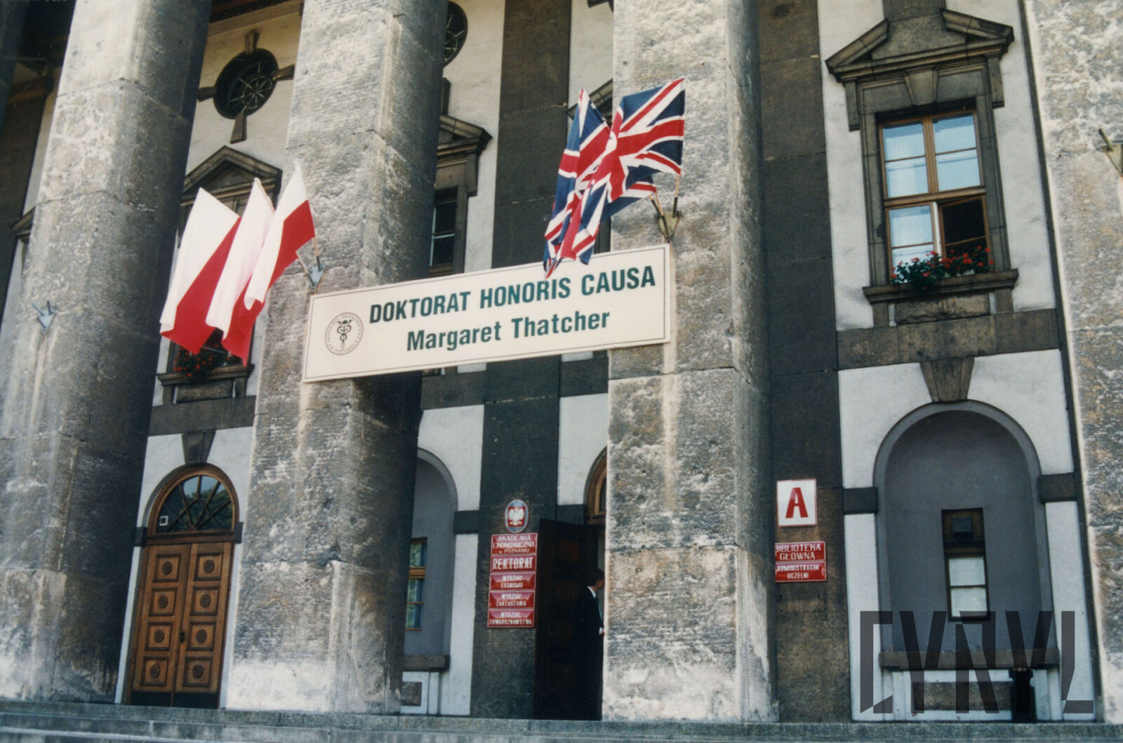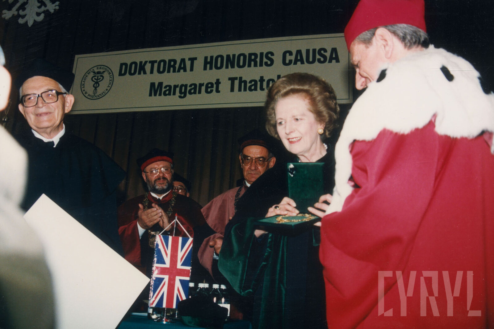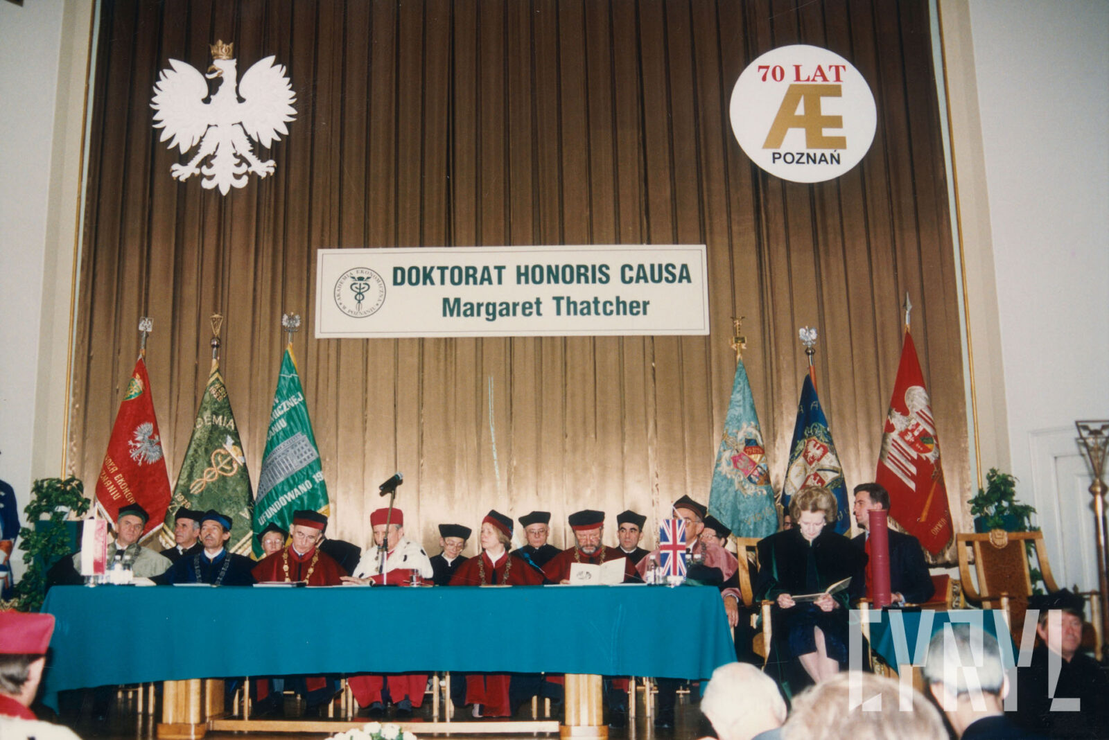 Następnego dnia, 4 lipca, w Auli Akademii Ekonomicznej odbył się kulminacyjny punkt wizyty Margaret Thatcher w Poznaniu – nadanie tytułu doktora honoris causa. Idea przyznania tego wyróżnienia byłej premier pojawiła się już rok wcześniej, a jej inicjatorem był rektor Akademii Ekonomicznej prof. Bohdan Gruchman. Uhonorowanie Thatcher doktoratem miało być także formą podziękowania za wsparcie dla działającej przy uczelni Wielkopolskiej Szkoły Biznesu, na rzecz której założony przez lady Margaret Fundusz Know How przekazał ponad 1,2 mln funtów. Promotorem doktoratu był jeden z najwybitniejszych polskich ekonomistów prof. Wacław Wilczyński. Na pamiątkę tego wydarzenia Thatcher otrzymała od władz uczelni pozłacaną miniaturkę oryginalnego łańcucha rektorskiego wykonaną w pracowni Wojciecha Kruka. W uroczystości wręczenia doktoratu poza władzami uczelni i miasta wzięła udział była premier RP Hanna Suchocka, a za oprawę artystyczną wydarzenia odpowiadał chór Stefana Stuligrosza.