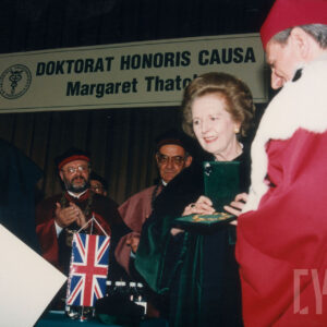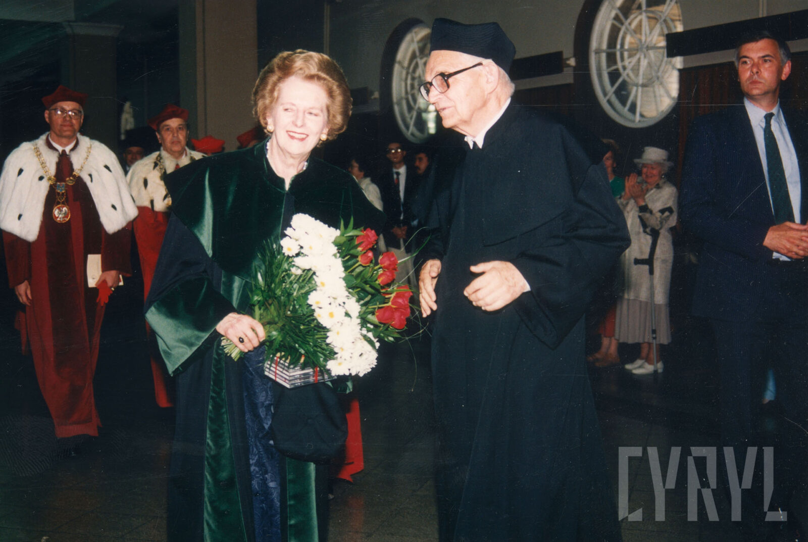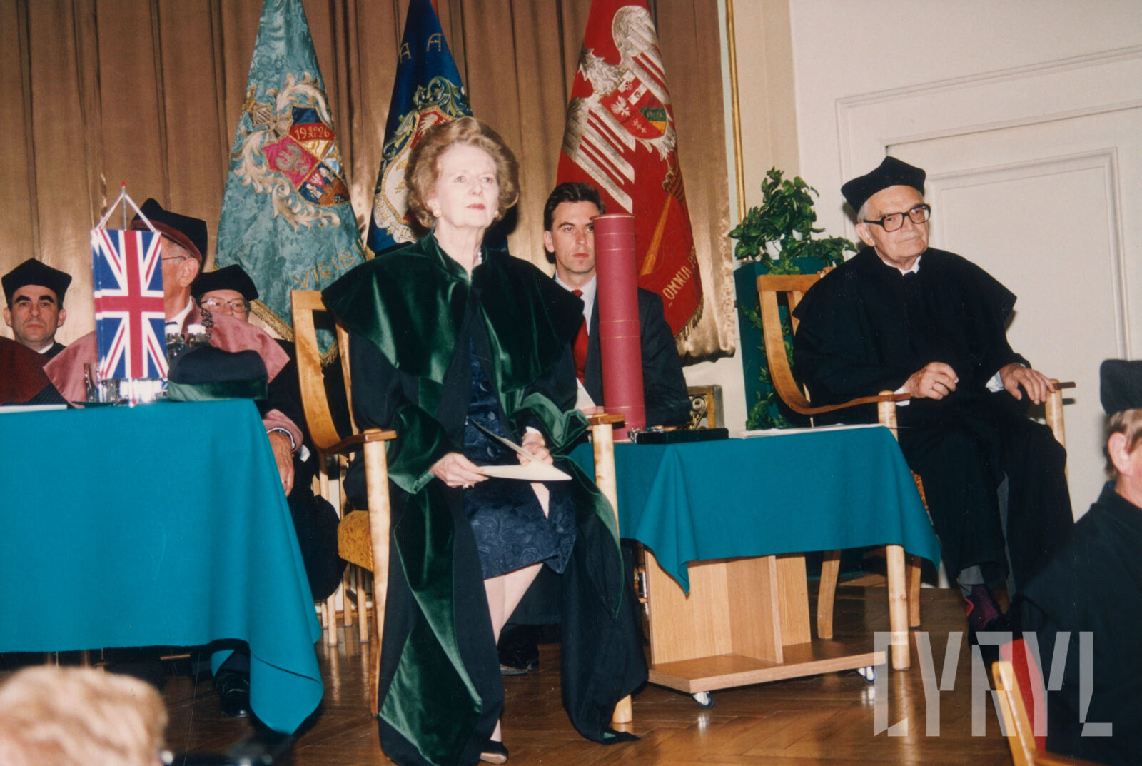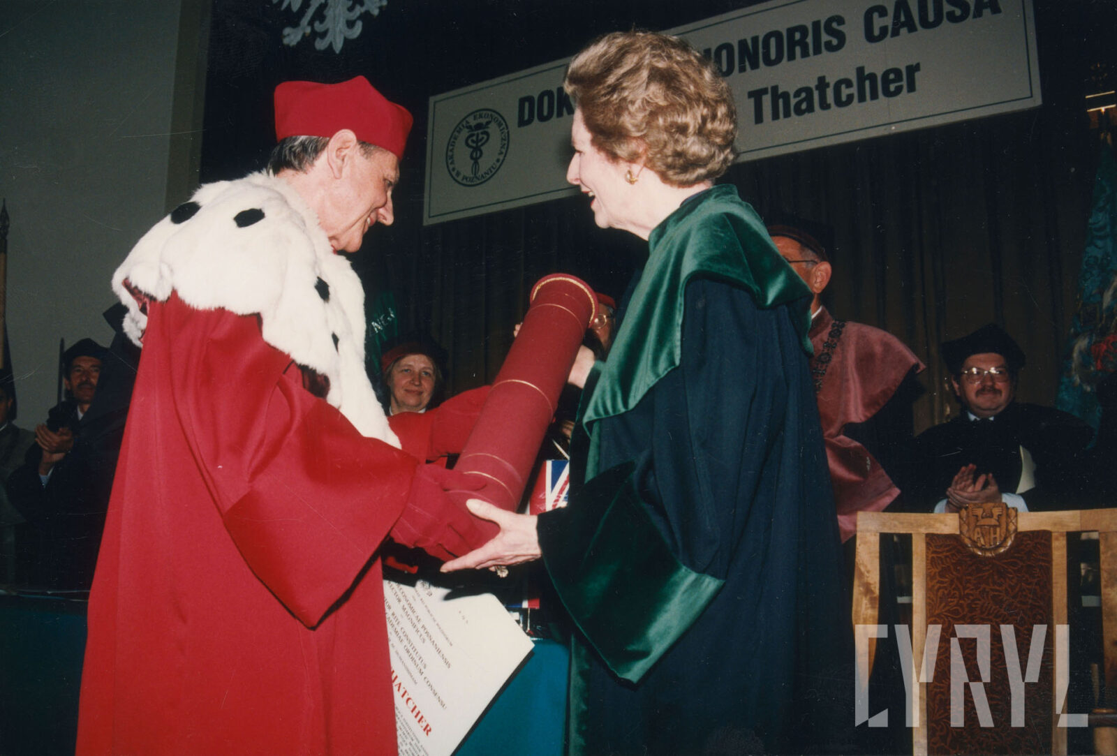Następnego dnia, 4 lipca, w Auli Akademii Ekonomicznej odbył się kulminacyjny punkt wizyty Margaret Thatcher w Poznaniu – nadanie tytułu doktora honoris causa. Idea przyznania tego wyróżnienia byłej premier pojawiła się już rok wcześniej, a jej inicjatorem był rektor Akademii Ekonomicznej prof. Bohdan Gruchman. Uhonorowanie Thatcher doktoratem miało być także formą podziękowania za wsparcie dla działającej przy uczelni Wielkopolskiej Szkoły Biznesu, na rzecz której założony przez lady Margaret Fundusz Know How przekazał ponad 1,2 mln funtów. Promotorem doktoratu był jeden z najwybitniejszych polskich ekonomistów prof. Wacław Wilczyński. Na pamiątkę tego wydarzenia Thatcher otrzymała od władz uczelni pozłacaną miniaturkę oryginalnego łańcucha rektorskiego wykonaną w pracowni Wojciecha Kruka. W uroczystości wręczenia doktoratu poza władzami uczelni i miasta wzięła udział była premier RP Hanna Suchocka, a za oprawę artystyczną wydarzenia odpowiadał chór Stefana Stuligrosza.