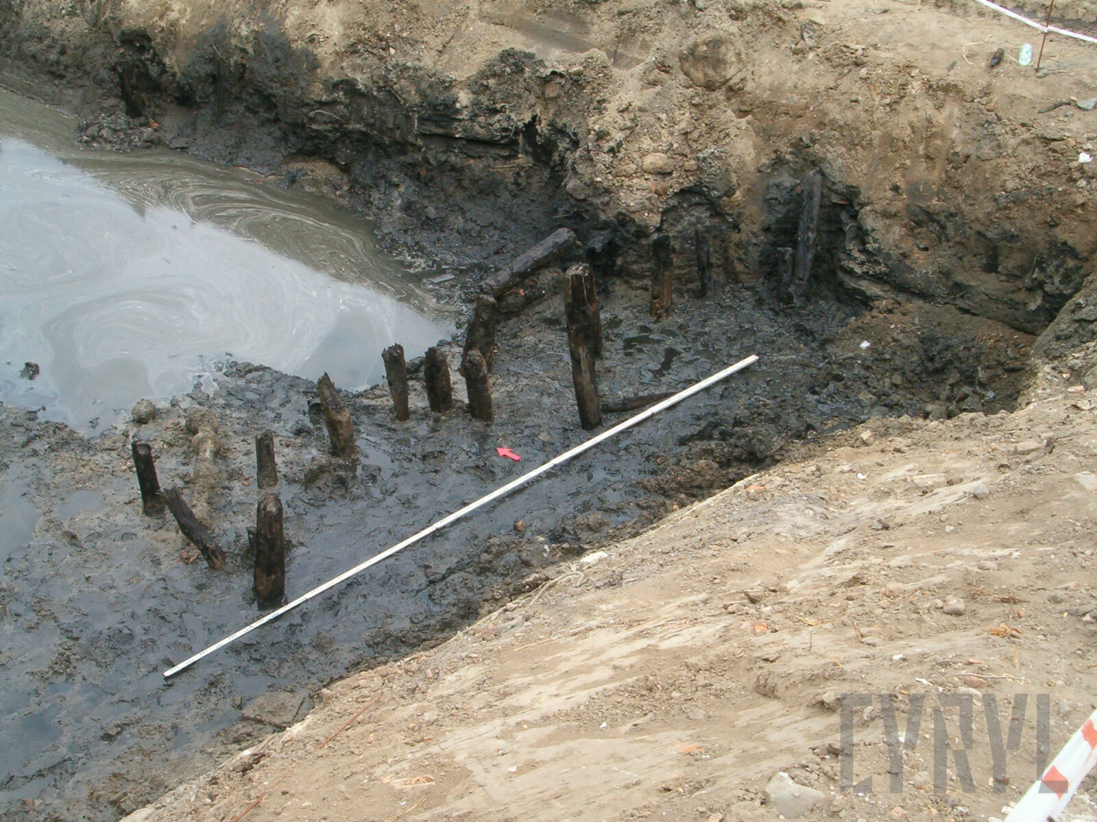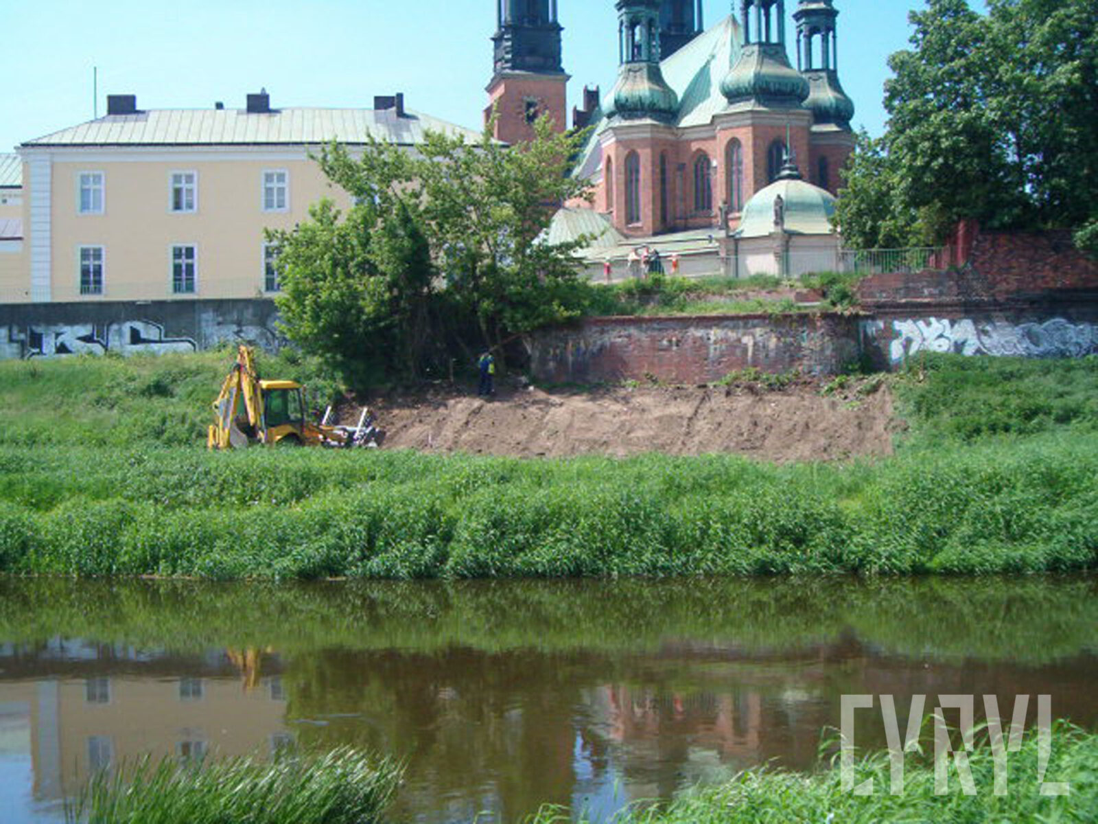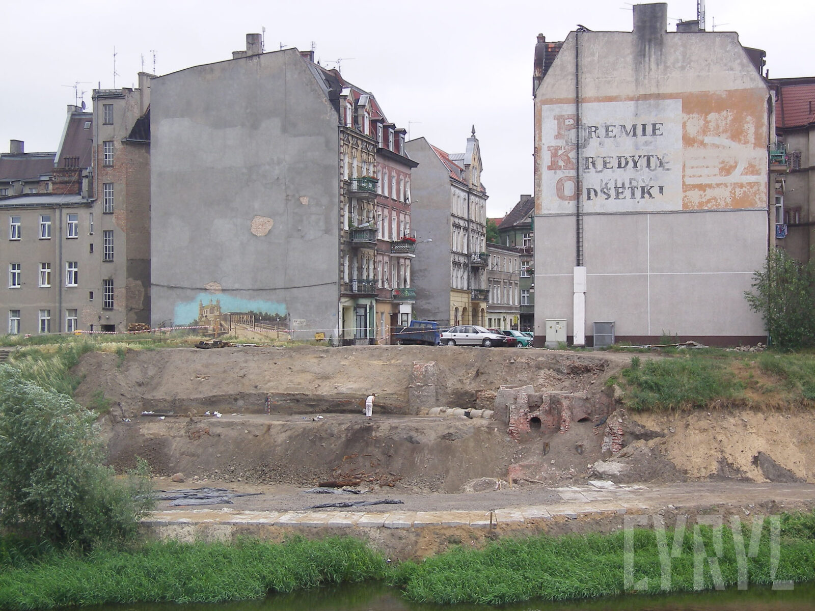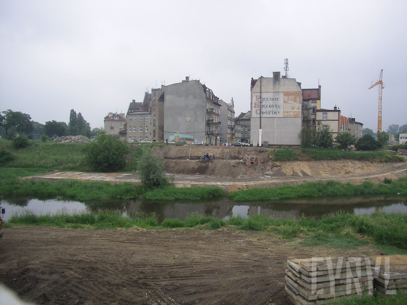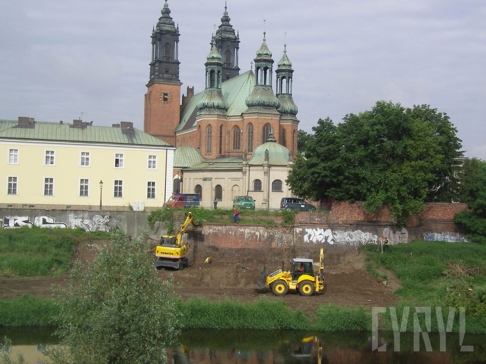W czasie prac archeologicznych w wykopie od strony Śródki odkryto pozostałości osadnictwa od X do XIX wieku, w tym relikty średniowiecznej zabudowy z około połowy XV wieku, a więc z czasów lokacji Ostrówka (1444), oraz kilka pali dębowych mostu wzniesionego w tym samym czasie. W wykopie od strony Ostrowa Tumskiego natrafiono na drewniane elementy konstrukcyjne kilku mostów, przede wszystkim najstarszego poznańskiego mostu wzniesionego w latach 70. X wieku w czasie wielkich modernizacji prowadzonych przez Mieszka I w związku z rozbudową umocnień grodowych. W ciągu około 50 lat od powstania tego mostu kilkakrotnie dokonywano jego napraw. Wśród odkrytych wczesnośredniowiecznych reliktów drewnianej przeprawy znajdują się przede wszystkim dębowe pale (ponad 30 sztuk), a także elementy tworzące poziomą część konstrukcji (fragmenty belek legarowych, relikty nawierzchni mostu). Natrafiono także na kilkanaście pali sosnowych wbitych w podłoże przy użyciu kafara, które tworzyły element nośny konstrukcji mostu wzniesionego w 1939 lub 1940 roku po wkroczeniu Niemców do Poznania w miejscu zniszczonego przez wycofującą się armię polską mostu z 1913 roku.