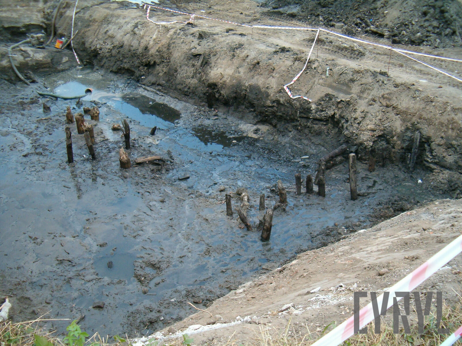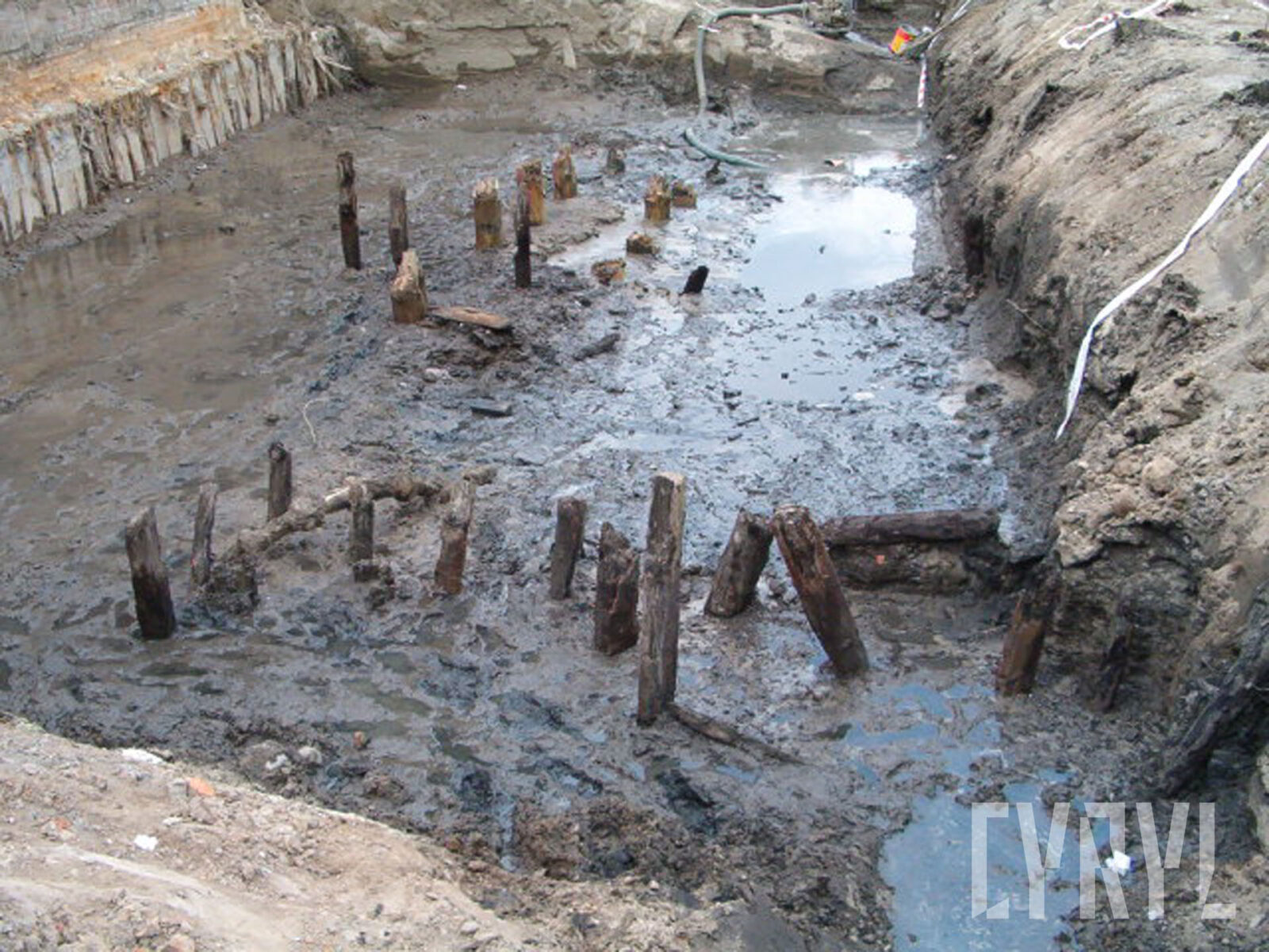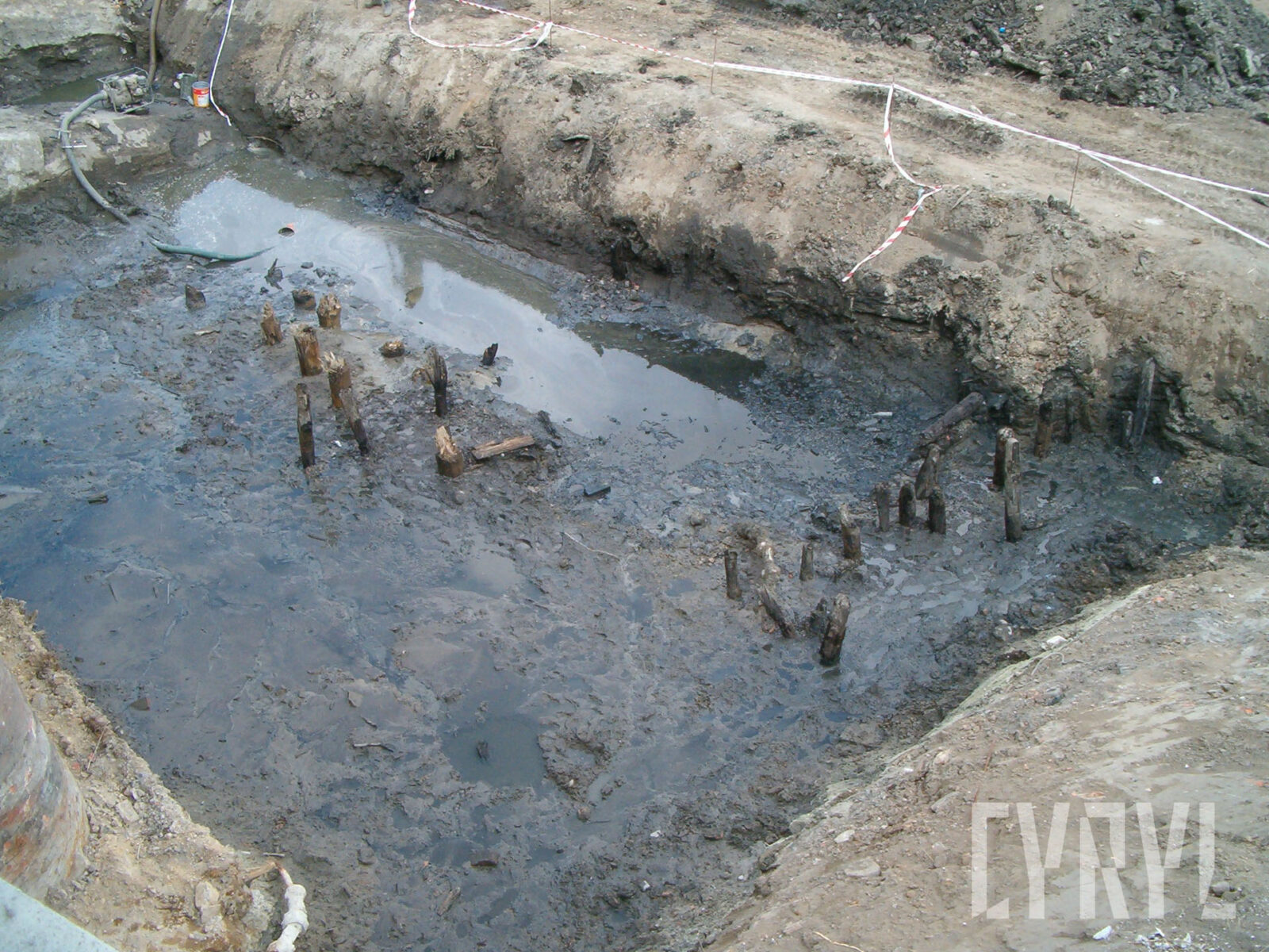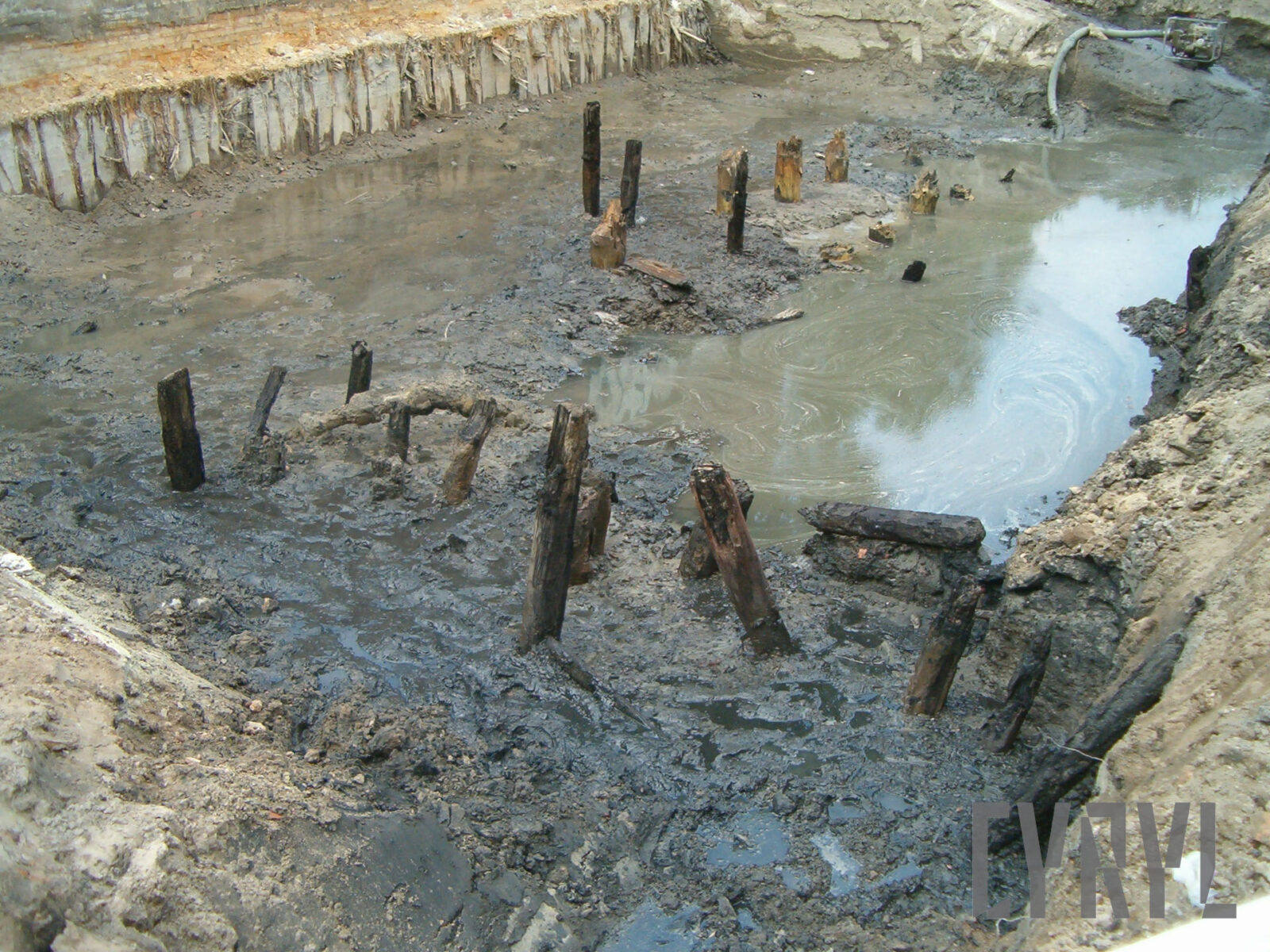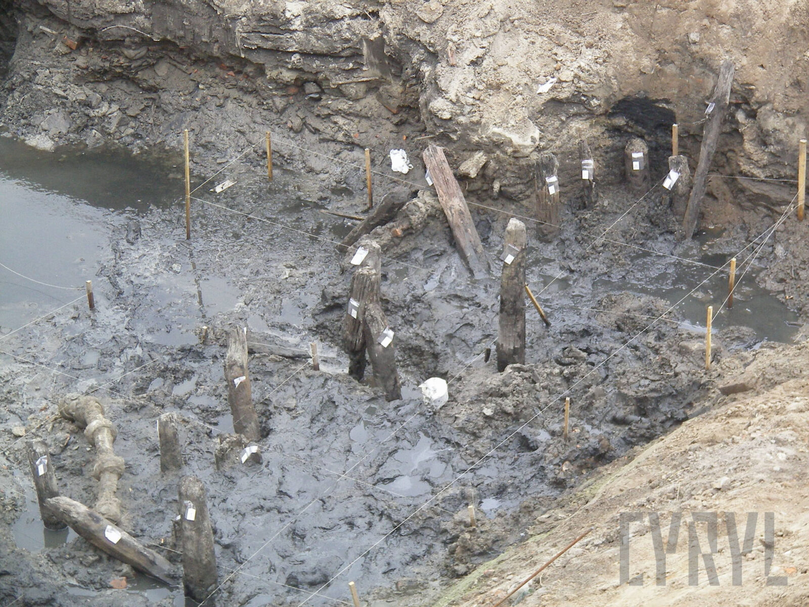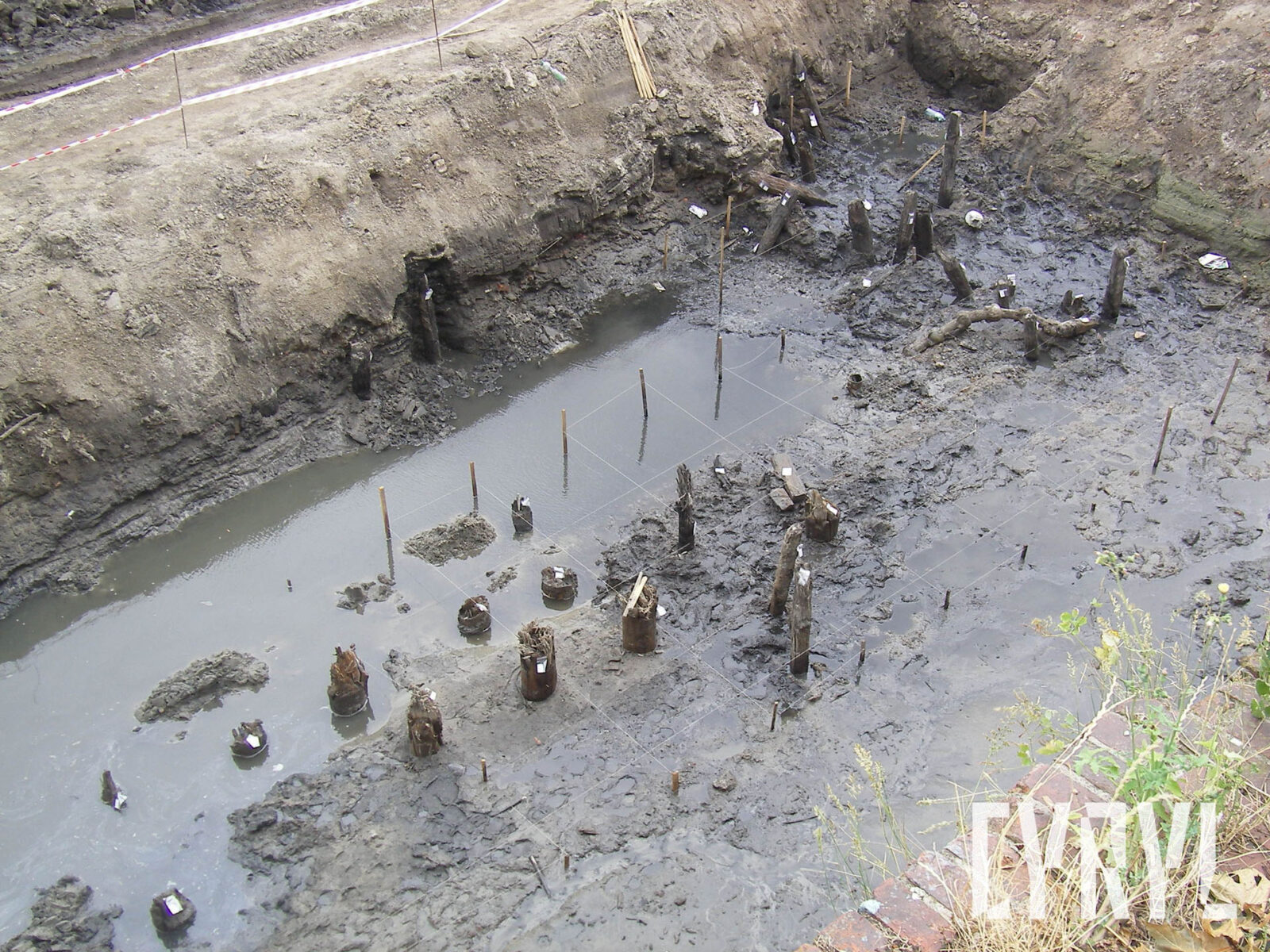 W czasie prac archeologicznych w wykopie od strony Śródki odkryto pozostałości osadnictwa od X do XIX wieku, w tym relikty średniowiecznej zabudowy z około połowy XV wieku, a więc z czasów lokacji Ostrówka (1444), oraz kilka pali dębowych mostu wzniesionego w tym samym czasie. W wykopie od strony Ostrowa Tumskiego natrafiono na drewniane elementy konstrukcyjne kilku mostów, przede wszystkim najstarszego poznańskiego mostu wzniesionego w latach 70. X wieku w czasie wielkich modernizacji prowadzonych przez Mieszka I w związku z rozbudową umocnień grodowych. W ciągu około 50 lat od powstania tego mostu kilkakrotnie dokonywano jego napraw. Wśród odkrytych wczesnośredniowiecznych reliktów drewnianej przeprawy znajdują się przede wszystkim dębowe pale (ponad 30 sztuk), a także elementy tworzące poziomą część konstrukcji (fragmenty belek legarowych, relikty nawierzchni mostu). Natrafiono także na kilkanaście pali sosnowych wbitych w podłoże przy użyciu kafara, które tworzyły element nośny konstrukcji mostu wzniesionego w 1939 lub 1940 roku po wkroczeniu Niemców do Poznania w miejscu zniszczonego przez wycofującą się armię polską mostu z 1913 roku.