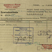 Zawiadomienie o rozłożeniu na raty opłaty za uzyskanie przez majora Edmunda Dutkiewicza pozwolenia na budowę domu mieszkalnego i lokalu handlowego przy ul. Marszałka Focha 55/5704.10.1947