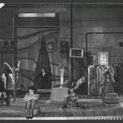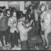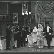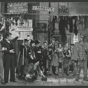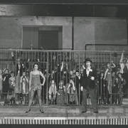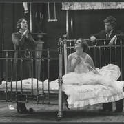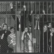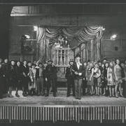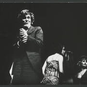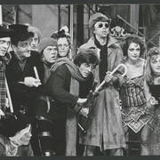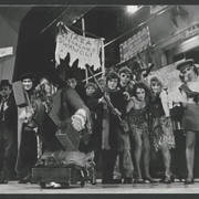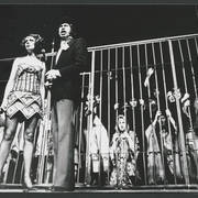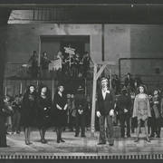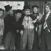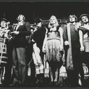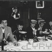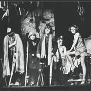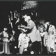 Marian Krawczyk, Bolesław Idziak, Leszek Dąbrowski, Wiesław Komasa, Jacek Różański, Janusz Michałowski w przedstawieniu "Opera za trzy grosze" Bertolta Brechta1974