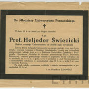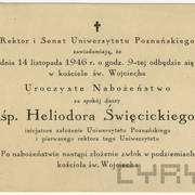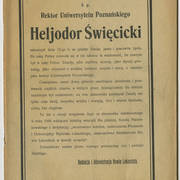 Pierwszy rektor Uniwersytetu Poznańskiego prof. Heliodor Święcicki po najwyższą uniwersytecką godność sięgnął w maju 1919 roku. Była ona z pewnością pięknym ukoronowaniem niezwykle pracowitego życia tego wybitnego patrioty i społecznika. Święcicki przyszedł na świat w Śremie, skąd po maturze udał się śladem swego zmarłego ojca na studia lekarskie do Wrocławia, które błyskawicznie ukończył, uzyskując w 1877 roku tytuł doktora wraz z dyplomem lekarza medycyny oraz chirurgii. W styczniu 1878 roku po dobyciu obowiązkowych praktyk w Dreźnie zamieszkał w Poznaniu, gdzie szybko zdobył uznanie, odgrywając z czasem coraz większą rolę wśród polskich elit miasta. Wysoka pozycja Święcickiego w stolicy Wielkopolski wynikała zarówno z jego niemałych i rozpoznawalnych nawet na arenie międzynarodowej sukcesów zawodowych, szeroko zakrojonej aktywności dobroczynno-charytatywnej oraz naukowo-organizacyjnej, jak i z zaangażowania w kulturalne życie Poznania, by wspomnieć choćby kontynuowaną do dziś tradycję tzw. Czwartków Literackich, których był pomysłodawcą oraz głównym organizatorem. Miarą jego rozległych naukowych sukcesów niech zaś pozostanie fakt, że już w 1900 roku otrzymał doktorat honoris causa Uniwersytetu Jagiellońskiego, zaś w 1913 roku pruskie władze przyznały mu tytuł profesora, co w przypadku Polaka, a w dodatku „zdeklarowanego nacjonalisty polskiego”, było osiągnięciem niezwykle rzadkim. Wreszcie w 1915 roku Święcicki objął stanowisko prezesa Poznańskiego Towarzystwa Przyjaciół Nauk, które dzięki niezwykle korzystnemu dla sprawy polskiej rozwojowi sytuacji międzynarodowej stało się w owym czasie naturalną platformą dla urzeczywistnienia marzeń kilku pokoleń poznańskich inteligentów dążących do założenia w ich mieście uniwersytetu. Nic zatem dziwnego, że to właśnie on stanął na czele Komisji Organizacyjnej Uniwersytetu Polskiego w Poznaniu, nazwanej później „Komisją Uniwersytecką”, stając się tym samym oczywistym kandydatem do przywdziania rektorskiej togi. Godność tę sprawował aż do śmierci w październiku 1923 roku, ciesząc się niezmiennym szacunkiem poznańskiego środowiska naukowego oraz bezgranicznym wręcz uwielbieniem okazywanym mu na każdym niemal kroku przez studentów najmłodszego w odrodzonej Polsce uniwersytetu.