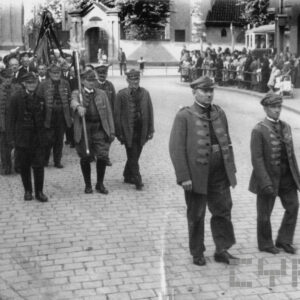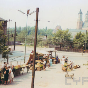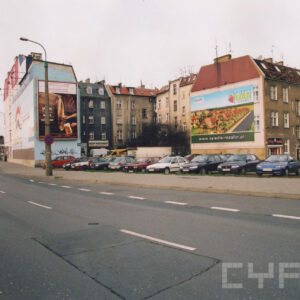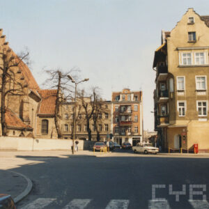 Południowa pierzeja Rynku Śródeckiego rozebrana w czasie budowy nowej trasy komunikacyjnej, w pierwszym budynku od lewej znajdowała się Komenda Dzielnicowa Milicji Obywatelskiej, na bocznej ścianie widoczny fragment reklamy gry liczbowej1969