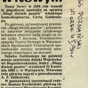 Antonina Choroszy (Beatrice z Turynu), Mirosław Kropielnicki (Truffaldino, sługa dwóch panów), Paweł Binkowski (Florindo Aretusi z Turynu) w spektaklu "Sługa dwóch panów" Carlo Goldoniego w reżyserii Romana Kordzińskiego21.01.1994