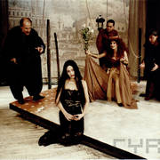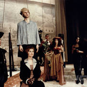 Antonina Choroszy (Beatrice z Turynu), Mariusz Puchalski (Pantalone dei Bisognosi), Mirosław Kropielnicki (Truffaldino, sługa dwóch panów) w spektaklu "Sługa dwóch panów" Carlo Goldoniego w reżyserii Romana Kordzińskiego31.12.1993