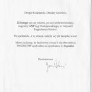 List Janusza Wiśniewskiego z gratulacjami dla aktorów występujących w spektaklu "Sny"