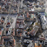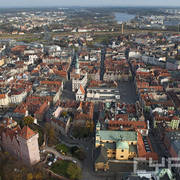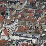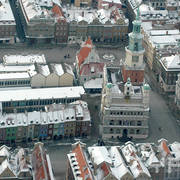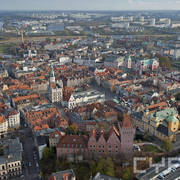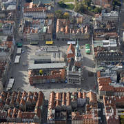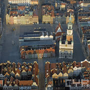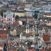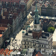 Walki o Poznań w 1945 roku zamieniły najważniejszy plac w mieście w ruinę. Widoki rynku z pierwszych powojennych lat budzą przerażenie skalą zniszczeń. W latach 50. i 60. XX wieku rynek odbudowano, w wielu miejscach rekonstruując zrównane z ziemią kamienice. Rozebrano Nowy Ratusz, budując w tym miejscu replikę dawnej Wagi Miejskiej. Na pustych placach po zniszczonych sukiennicach, arsenale i jatkach rzeźniczych stanęły dwa modernistyczne pawilony, które do dzisiaj budzą kontrowersje. Całe założenie urbanistyczne w obecnym kształcie doskonale widać na uzupełniających kolekcję miejskiego konserwatora zabytków współczesnych zdjęciach lotniczych Marka Kaczmarczyka, które w niezwykły sposób oddają jego urodę, dodatkowo pokazując mało widoczną z poziomu placu krzywiznę posadowienia domków budniczych w celu wyeksponowanie ratusza, najważniejszego budynku w mieście. Niektóre zdjęcia z lotu ptaka, wykonane w pięknym porannym słońcu, przypominają precyzyjnie wykonaną makietę z doskonale widocznymi detalami architektonicznymi rynkowej zabudowy.
