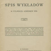 Spis wykładów, które odbywały się na Uniwersytecie Poznańskim jesienią 1919 roku, to rewelacyjne źródło do historii uczelni. Ciekawy jest już fakt, że na stronie tytułowej broszury widnieje nazwa Uniwersytet Poznański, a w licznych źródłach znajduje się informacja, iż w tym czasie uczelnia nosiła jeszcze oficjalną nazwę Wszechnicy Piastowskiej (nazwę Uniwersytet Poznański otrzymała dopiero rozporządzeniem z 10 kwietnia 1920 roku). Pierwszym wydziałem nowej szkoły wyższej był Wydział Filozoficzny powołany 1 kwietnia 1919 roku, ponad miesiąc przed oficjalną inauguracją uczelni 7 maja 1919 roku. Jesienią szkoła miała już trzy wydziały: Filozoficzny, Prawa i Nauk Ekonomiczno-Politycznych oraz Rolniczo-Leśny. Spis pokazuje, jakie tematy realizowano w pierwszym roku działalności uczelni, a przede wszystkim, kto je prowadził. Wśród wykładowców znajdują się nazwiska wybitnych naukowców i nauczycieli akademickich, profesorów, którzy na zawsze zapisali się w historii Poznania: Sobeskiego, Peretiatkowicza, Zakrzewskiego, Skałkowskiego, Kostrzewskiego, Dettloffa, Pollaka, Grochmalickiego, Taylora czy Schramma. Niepozorne wydawnictwo o wielkiej wadze dla badaczy dziejów miasta i najstarszego poznańskiego Uniwersytetu.