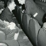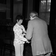 Krytyk muzyczny Jerzy Waldorff (siedzi) rozmawia z dziennikarzem w czasie IV Międzynarodowego Konkursu Skrzypcowego im. Henryka Wieniawskiego04.11.1962–18.11.1962