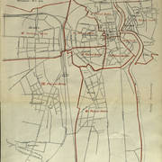 Plan Poznania w skali 1:16 000 z zaznaczonym kolorowym obrysem granic policyjnych rewirów i nazwami ważniejszych ulic w niemieckojęzycznej broszurze o sytuacji mieszkaniowej w Poznaniu w latach 1905-061907