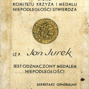 Dokument stwierdzający przyznanie Janowi Jurkowi odznaczenia "Medal Niepodległości" zgodnie z zarządzeniem prezydenta RP z dnia 9 listopada 1932 roku1932