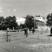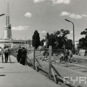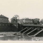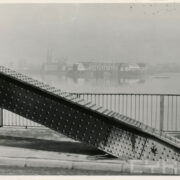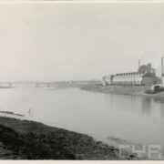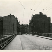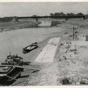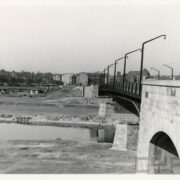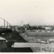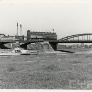 Zachodnie koryto ulgowe Warty między Chwaliszewem i Ostrowem Tumskim, po lewej zniszczony w czasie II wojny światowej most kolejowy do gazowni, w głębi prowizoryczny most Bolesława Chrobrego, za nim elektrownia1960