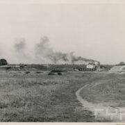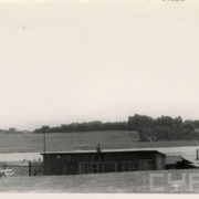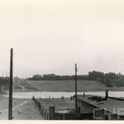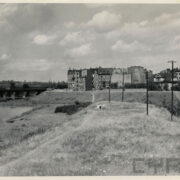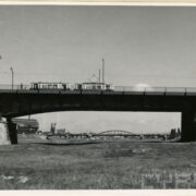 Most kolejowy łączacy Starołękę z Dębiną (po prawej), z lewej za przyczółkiem mostu drzewa w tzw. Ogrodzie Kampfa, restauracji funkcjonującej w Starołęce przed I wojną światową1960