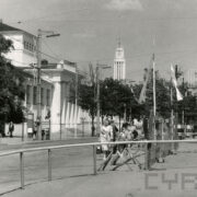 Most Rocha, po prawej pierwszy gmach Politechniki Poznańskiej na Piotrowie (ówczesny budynek Wydziału Budownictwa Lądowego), na pierwszym planie dolina Warty1960